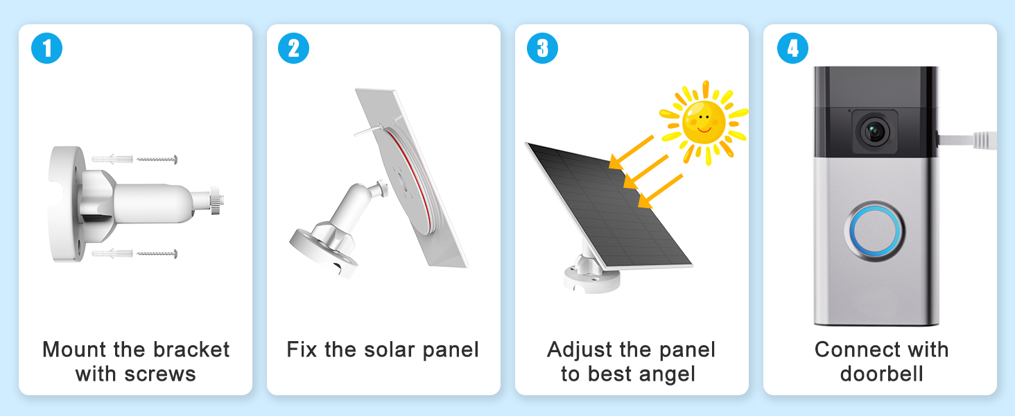 ➤ سهولة التركيب: دعامة 360 درجة تسمح للوحة الشمسية لجرس الباب بإيجاد أفضل زاوية للحصول على ضوء الشمس، ويساعدك الكابل بطول 13 قدم على تثبيت اللوحة الشمسية في المكان المناسب.