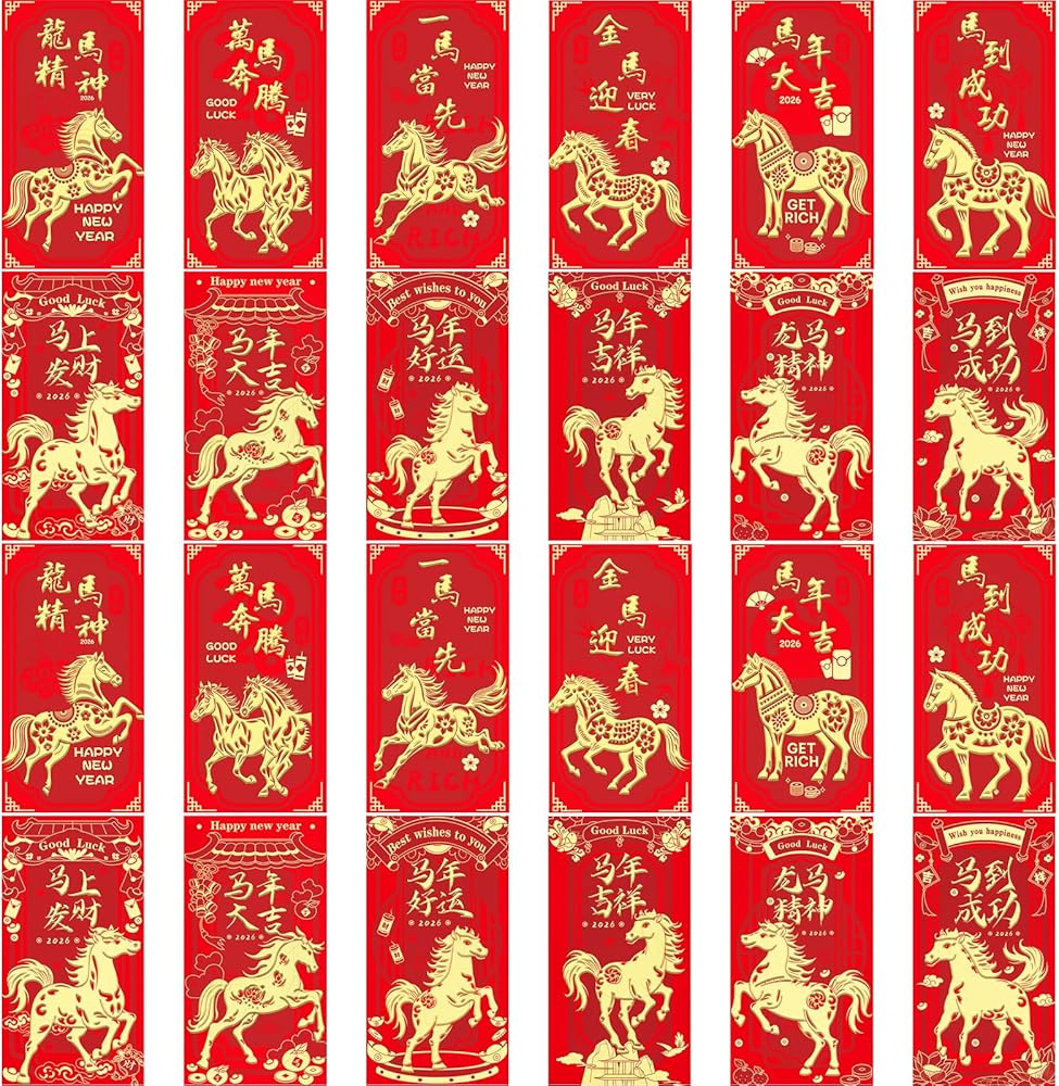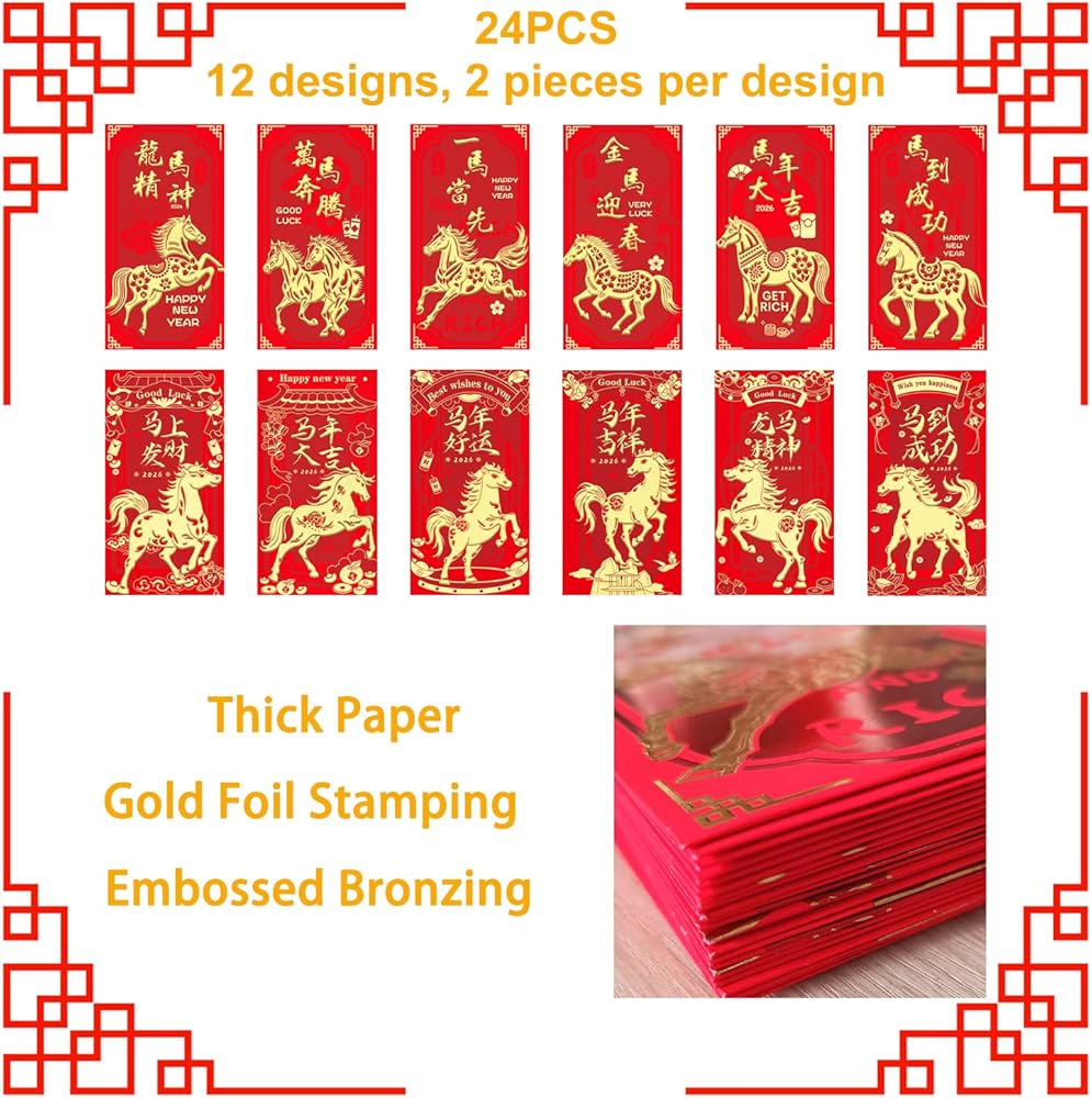 Red Envelopes Chinese New Year Of The Horse 2026,24 PCS (12 designs,2 pieces per design),Lunar New Year Decorations,New Years Eve Party Supplies Gifts,Hong Bao Money Envelopes For Cash.