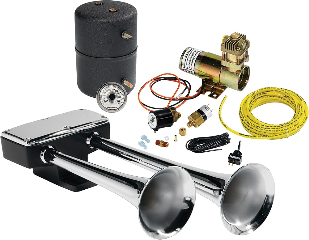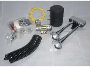 Audible for 1 mile (133 decibels) Patented sound chamber factory tuned for life Super heavy-duty air tank - Certified Leakproof Black body, chrome projectors & cover, dual horn Horn Dimensions: 15¼" L x 7" W x 3H" H Kit includes: horn, electric compressor, air tank, solenoid, toggle switch, nylon tubing, air gauge, auxiliary air fill hose. 125 PSI capacity. Features: