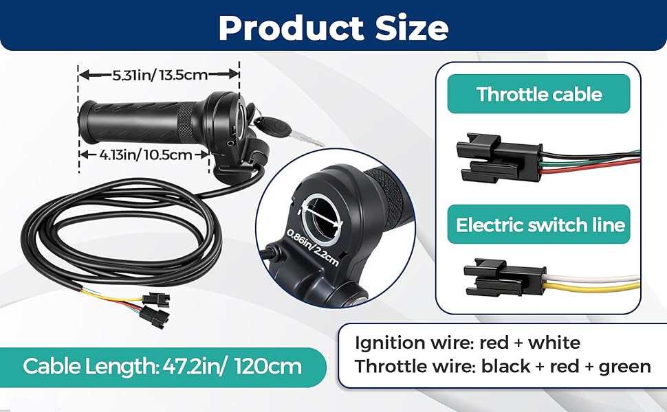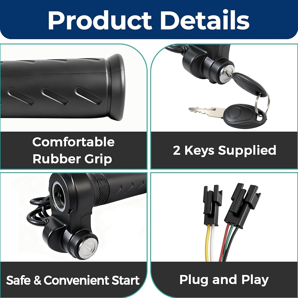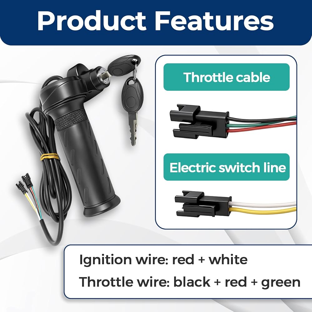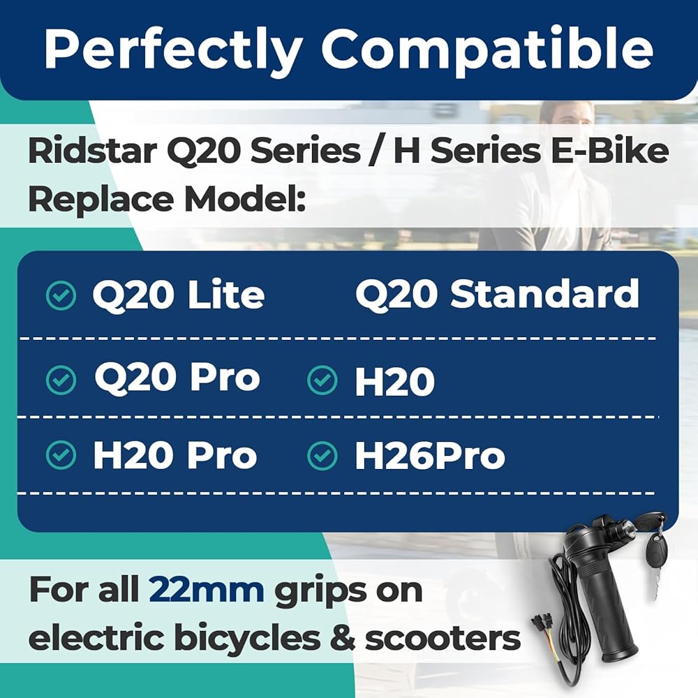سهولة التركيب: هذا البديل لخانق الدراجة الإلكترونية Ridstar Q20 الكامل هو التوصيل والتشغيل. يتصل السلك الأصفر/الأبيض بمفتاح الطاقة. تنقل الأسلاك السوداء/الأخضر/الحمراء إشارات الخانق. عند تكييف هذه القبضة مع Ridstar Q20، قد يكون الخانق لـ Ridstar Q20 ضروريًا لتبديل الأسلاك الحمراء والخضراء.