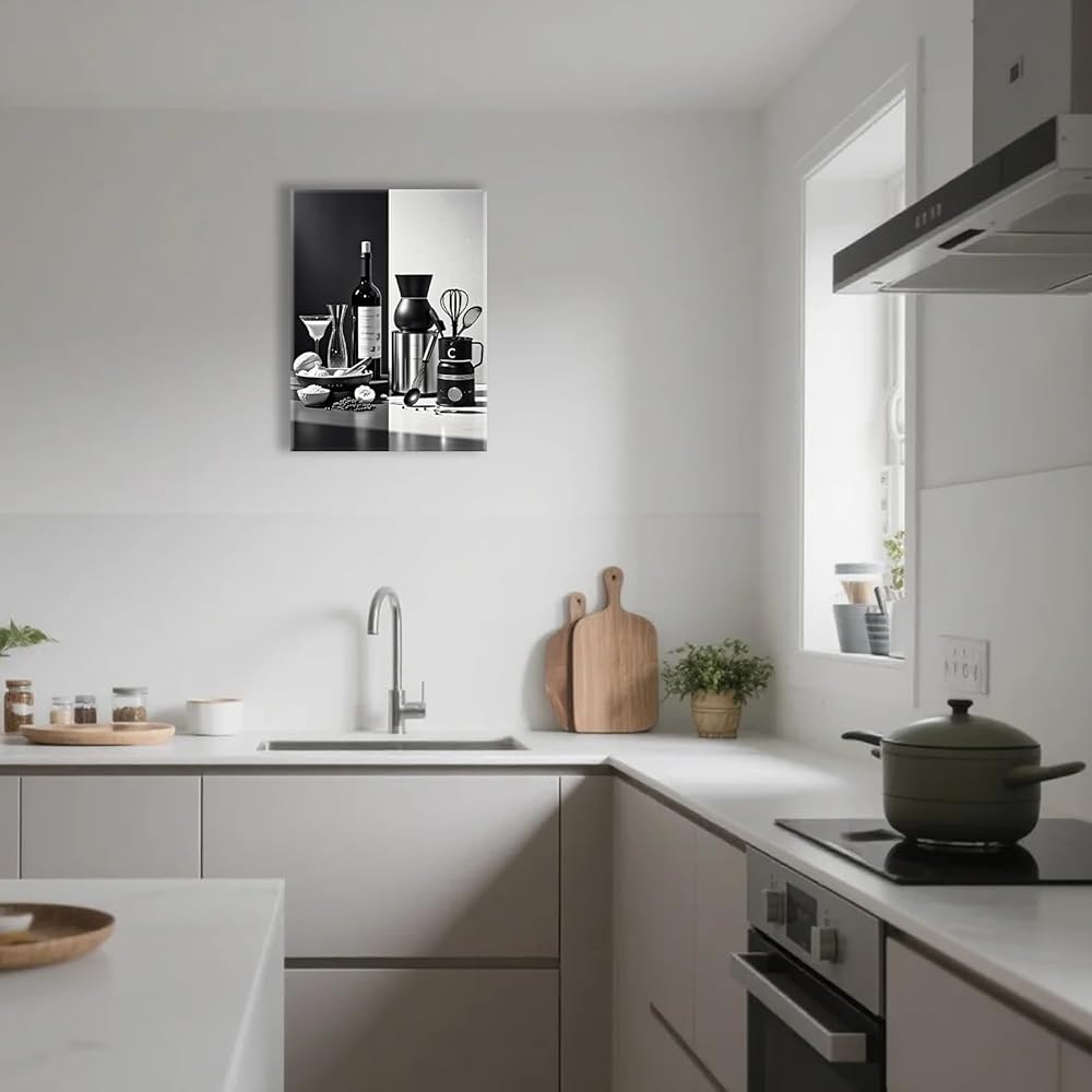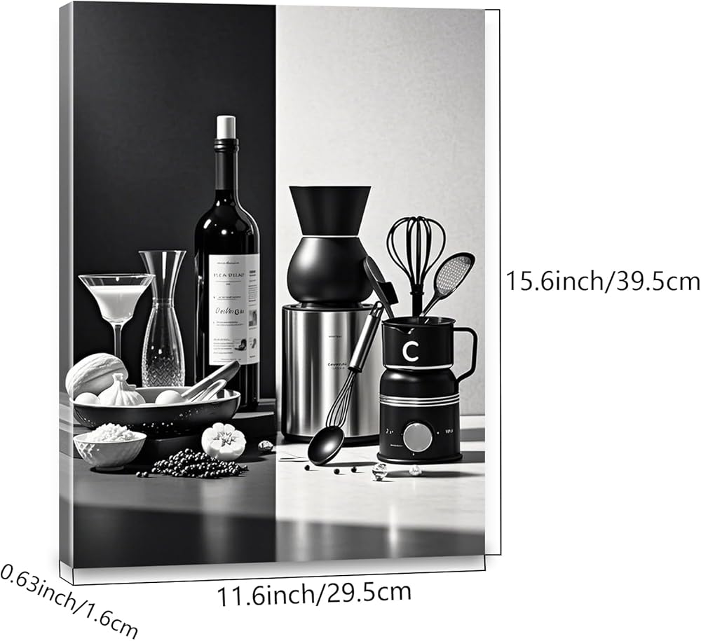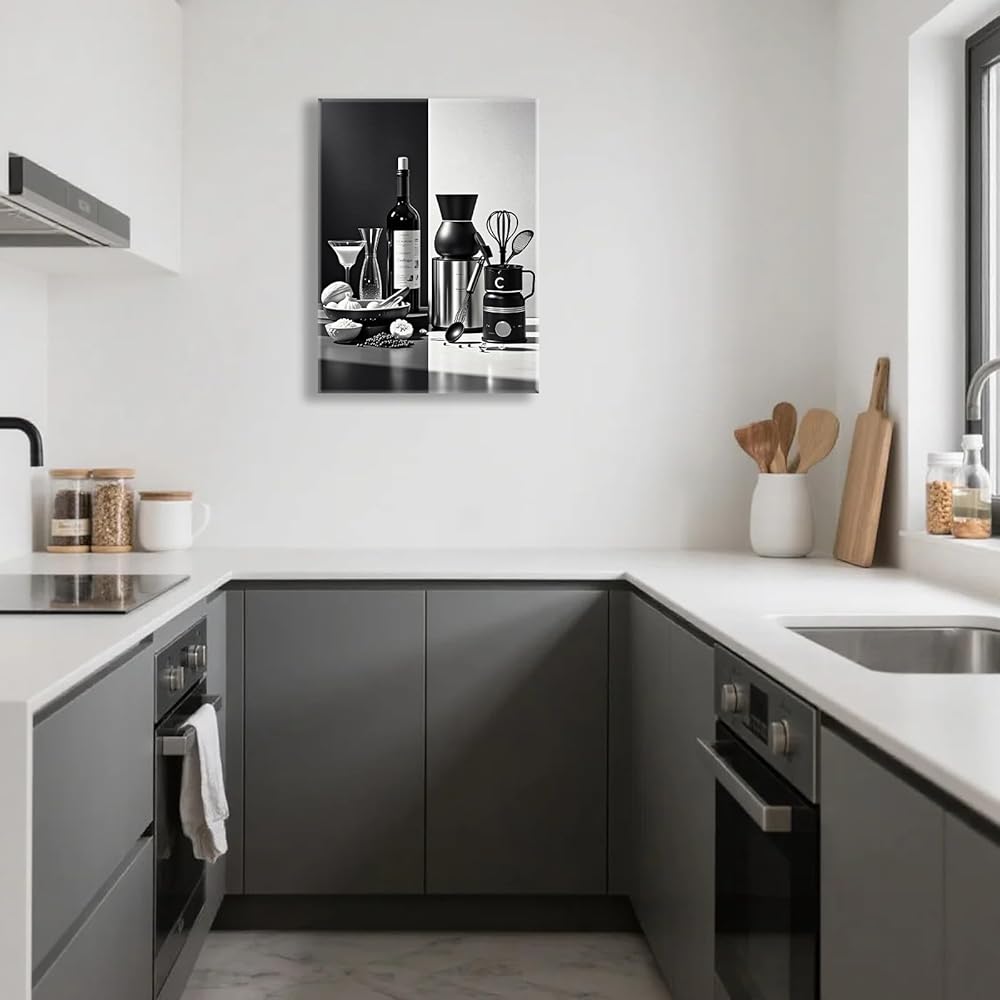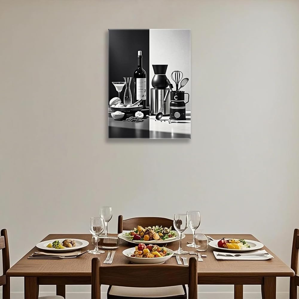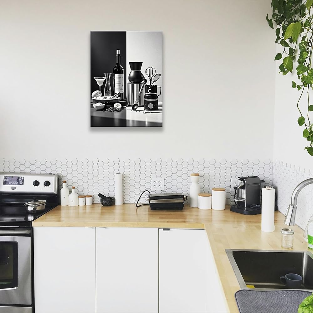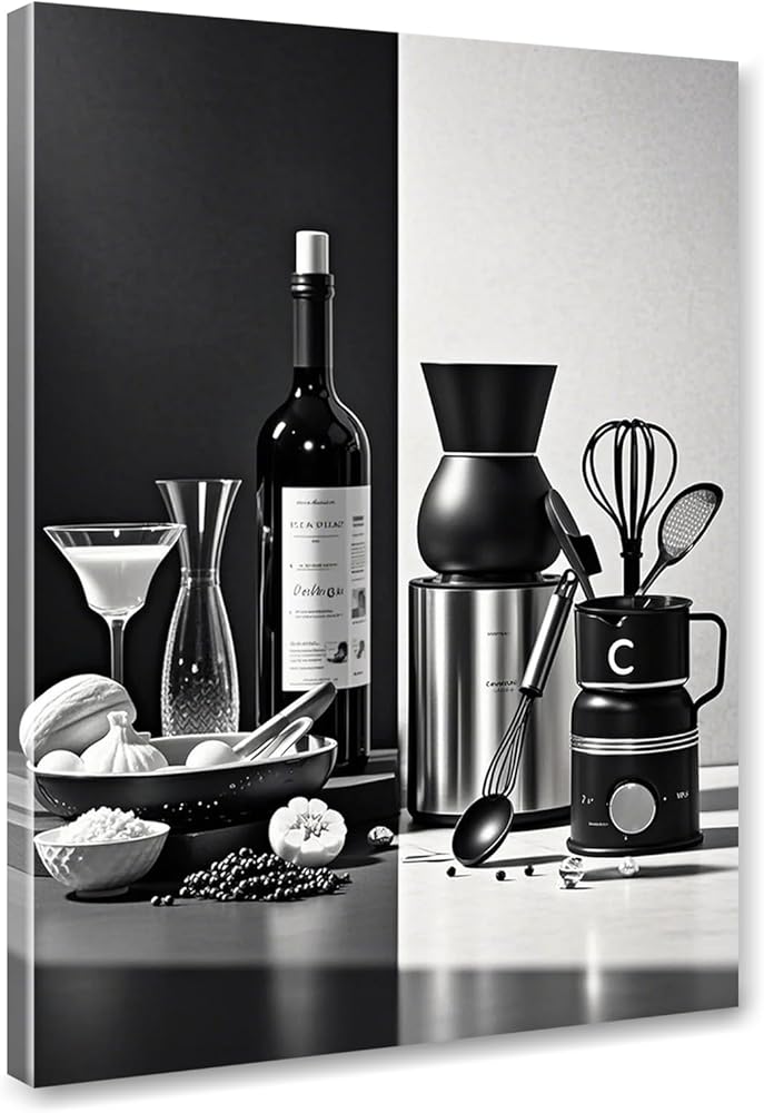 أبيض وأسود المطبخ قماش جدار الفن غرفة الطعام جدار ديكور زجاجة النبيذ التوابل ملعقة المطبخ صورة ملصق يطبع العمل الفني اللوحة غرفة الطعام مطعم بار ديكورات المنزل 12x16 بوصة مؤطرة