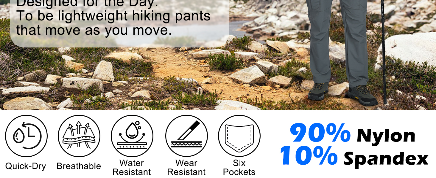 Durable & Comfortable Fabric: 90% Nylon+10% Spandex material.Mens Hiking Pants offer exceptional elasticity and are lighter, more breathable, quick-drying, and water resistant than regular blends, making men's pants an ideal choice for long trips and outdoor adventures