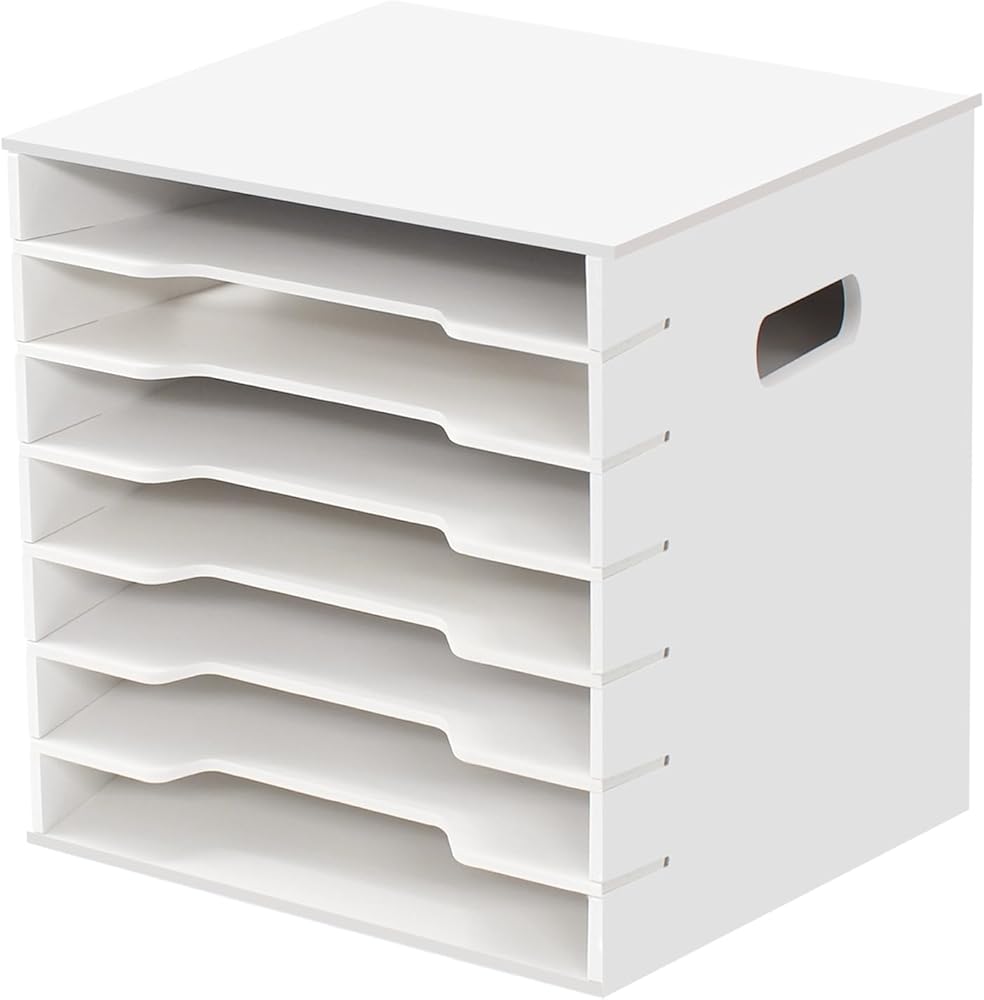 【Scientific Partitioning】 The assembled paper storage measures approximately 12 inches (L) x 13 inches (W) x 11.8 inches (H), with each shelf 1.46 inches high. Designed specifically for 12 x 12 inch paper, it provides ample storage space in craft rooms, home offices, or any space-constrained environment, keeping your precious papers flat and organized.