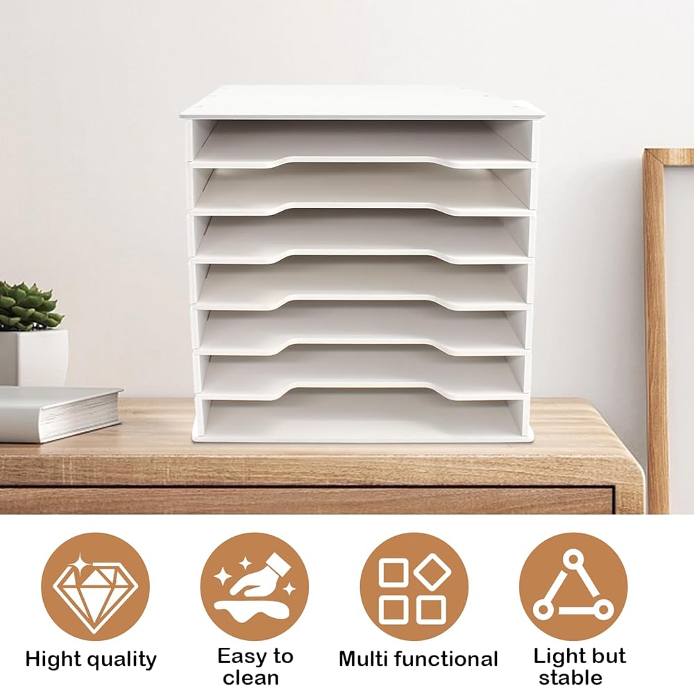 【Vertical Expansion】This 7-tier scrapbook paper organizer away from traditional storage space limitations with its vertical stacking design. It consolidates scattered files, documents, and office supplies upwards, instantly reducing the load on your desktop. This avoids the problem of insufficient capacity in a single-layer organizer and prevents inconvenience from too many layers, creating a clean and organized environment for efficient work and study.