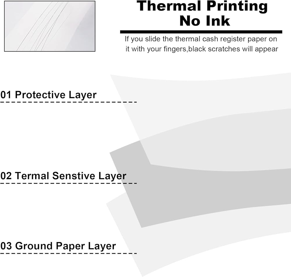 【خصائص المواد والطباعة】يتم تصنيع لفات الورق من مادة طلاء حراري، مما يلغي الحاجة إلى الحبر أو الشريط أثناء عملية الطباعة. مادة المنتج خالية من مادة BPA (Bisphenol A) وخالية من BPS (Bisphenol S).