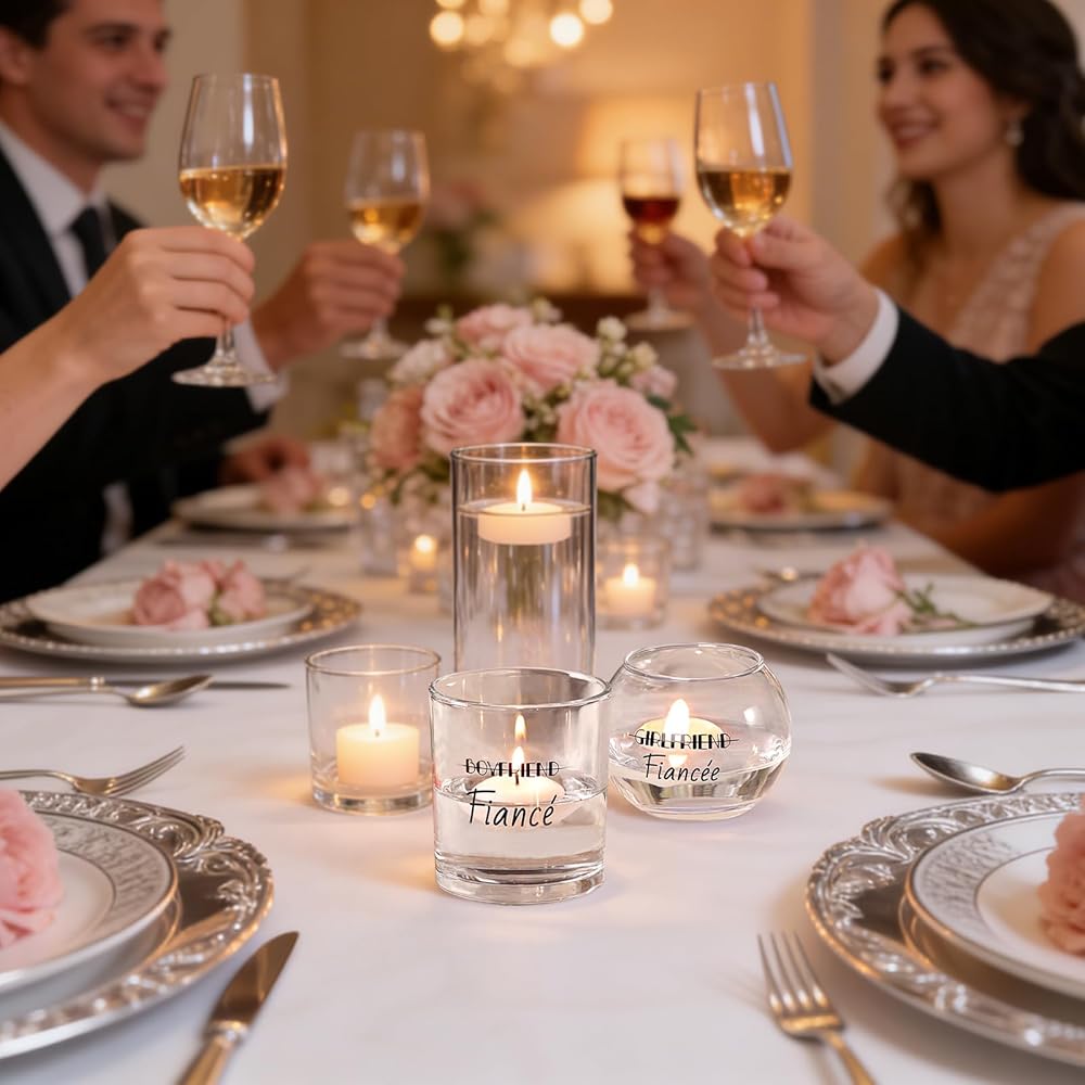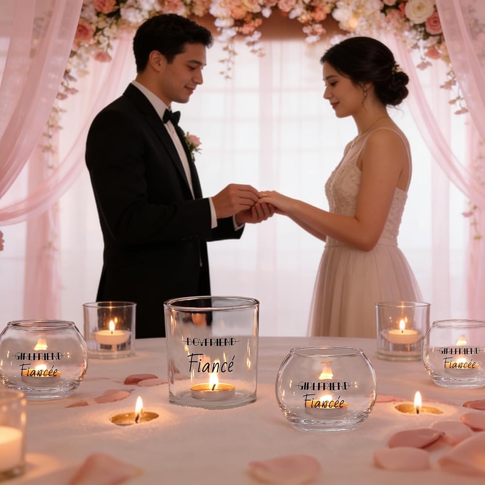 مجموعة هدايا الخطوبة: هذه المجموعة المكونة من 12 قطعة هي خيار مفيد لهدايا الخطوبة للأزواج، وتتميز بحاملات شموع متطابقة مطبوعة عليها "Boyfriend → Fiancé" و"Girlfriend → Fiancée". طريقة ساحرة للاحتفال بالانتقال من المواعدة إلى الأبد.