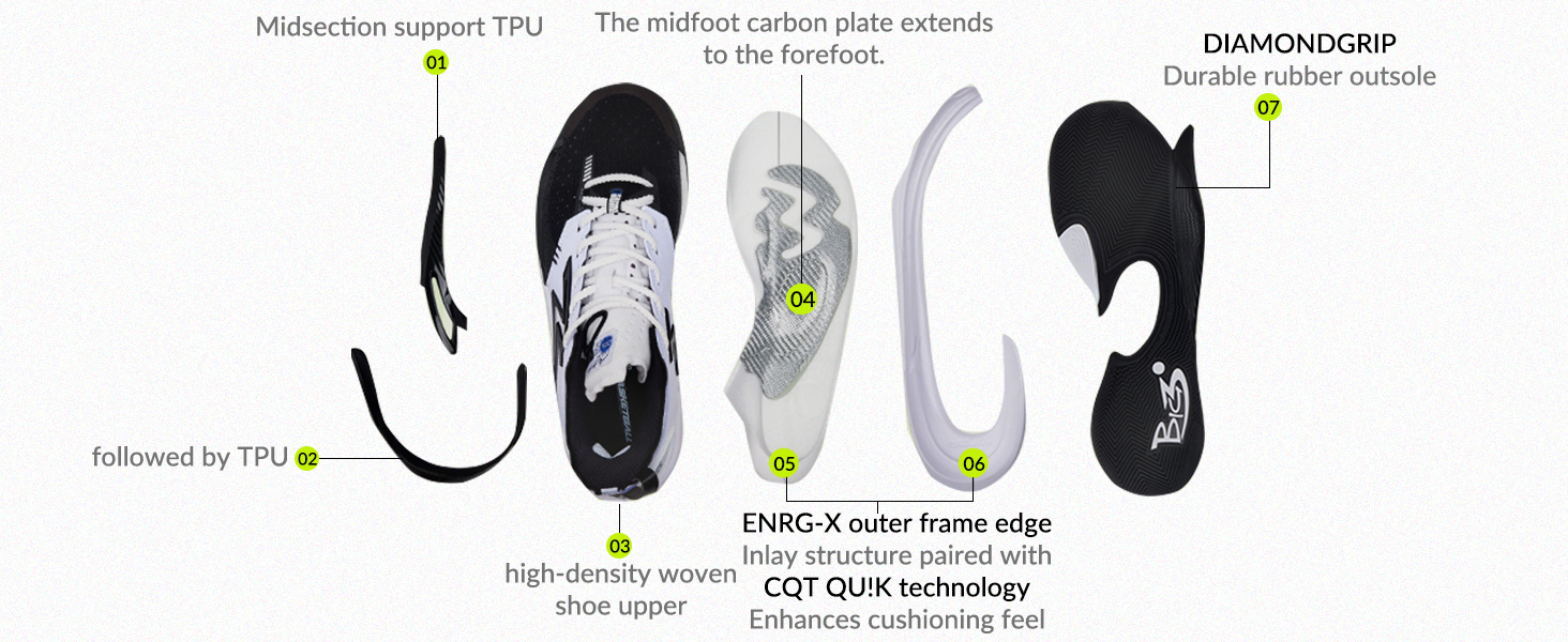 Qu!kBONE carbon-fiber plate and upward TPU for better stability.