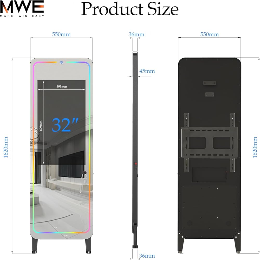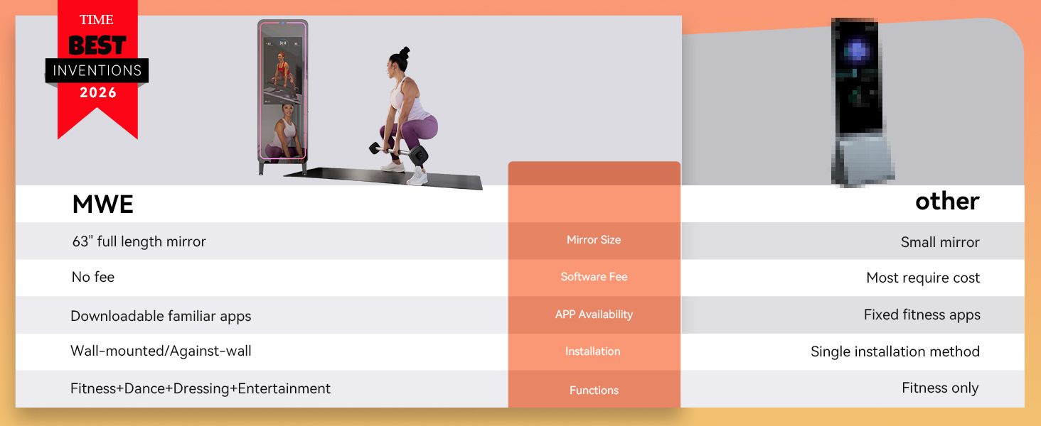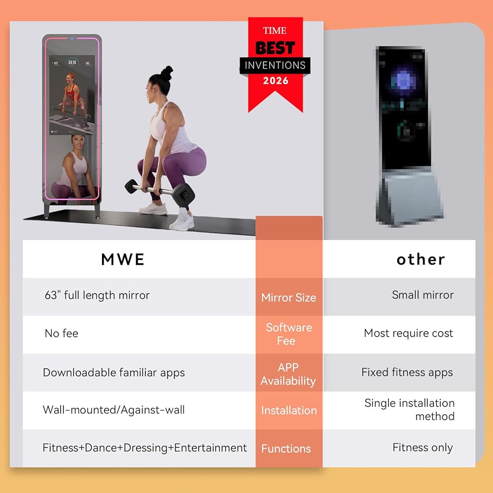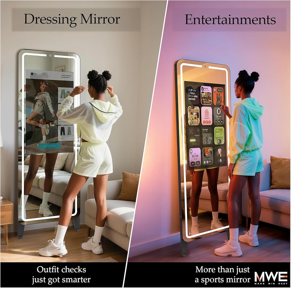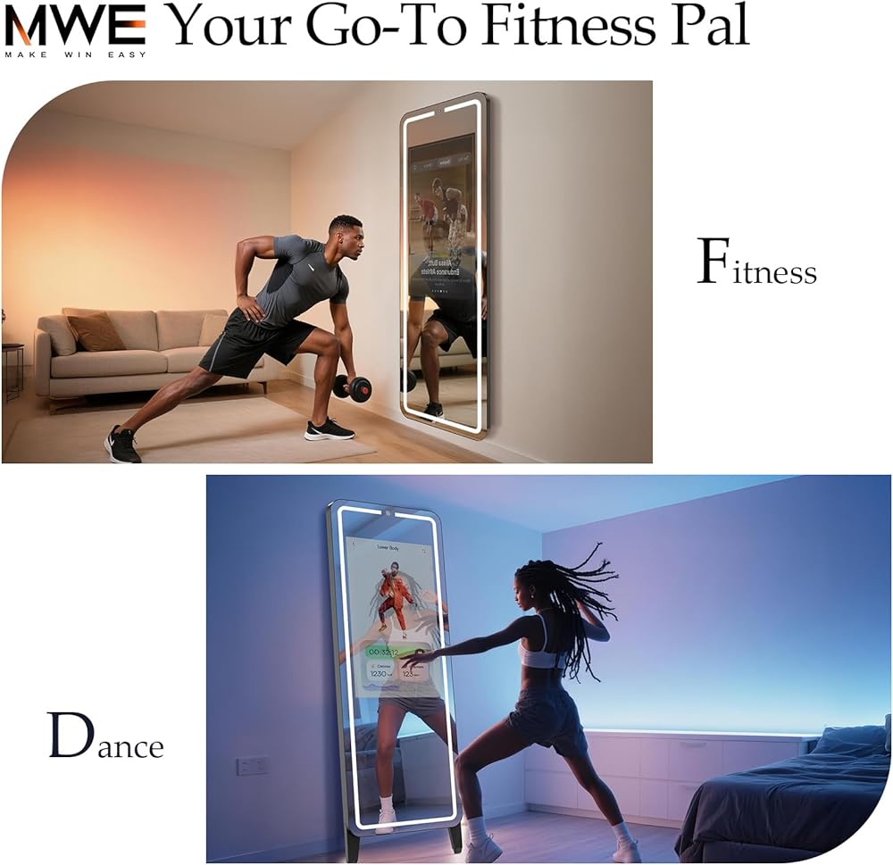 مرآة كاملة الحجم مقاس 63 بوصة للاستخدام متعدد الاستخدامات: هذه المرآة التي يبلغ ارتفاعها 63 بوصة مناسبة لمعظم الأطوال. يمكنك بسهولة مراقبة حركات جسمك بالكامل أثناء التمرين والرقص، وتصحيح وضعك من خلال المرآة. مرآة MWE الذكية أيضًا مرآة ارتداء الملابس، مما يسمح لك ليس فقط بالتحقق من ملابسك الخاصة، ولكن أيضًا مقارنتها بالملابس الموجودة على وسائل التواصل الاجتماعي من خلال الشاشة الرقمية.