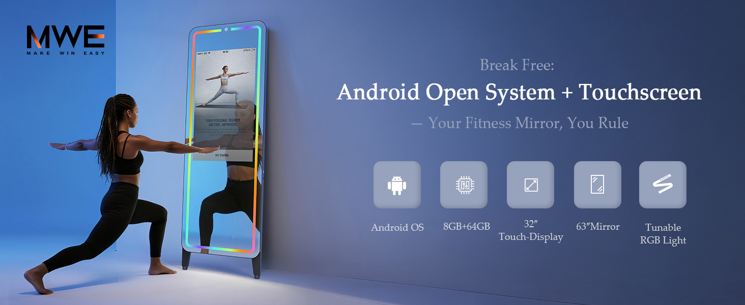 نظام أندرويد مفتوح متقدم: مدعوم من أندرويد، تتميز هذه المرآة الذكية MWE بنظام تشغيل مفتوح بالكامل يتيح لك تنزيل واستخدام أي تطبيق تحبه - من منصات اللياقة البدنية مثل Peloton وNike Training Club إلى تطبيقات الترفيه للموسيقى أو مقاطع الفيديو. مع ذاكرة وصول عشوائي سعتها 8 جيجابايت ومساحة تخزين 64 جيجابايت، فإنه يضمن تعدد المهام على نحو سلس ومساحة واسعة لتطبيقاتك المفضلة، مما يجعل تجربة اللياقة البدنية الخاصة بك قابلة للتخصيص حقًا