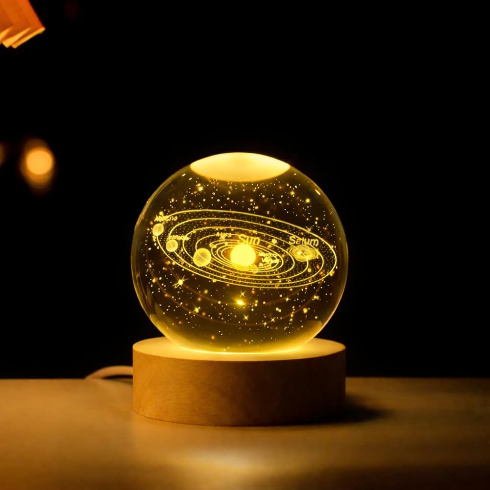 كرات كريستال ثلاثية الأبعاد للنظام الشمسي مع قاعدة إضاءة خشبية، مصباح زجاجي على شكل كوكب الكون ضوء ليلي، هدية مصباح ديكور لعيد الميلاد للبالغين والأطفال والأولاد والبنات والمراهقين