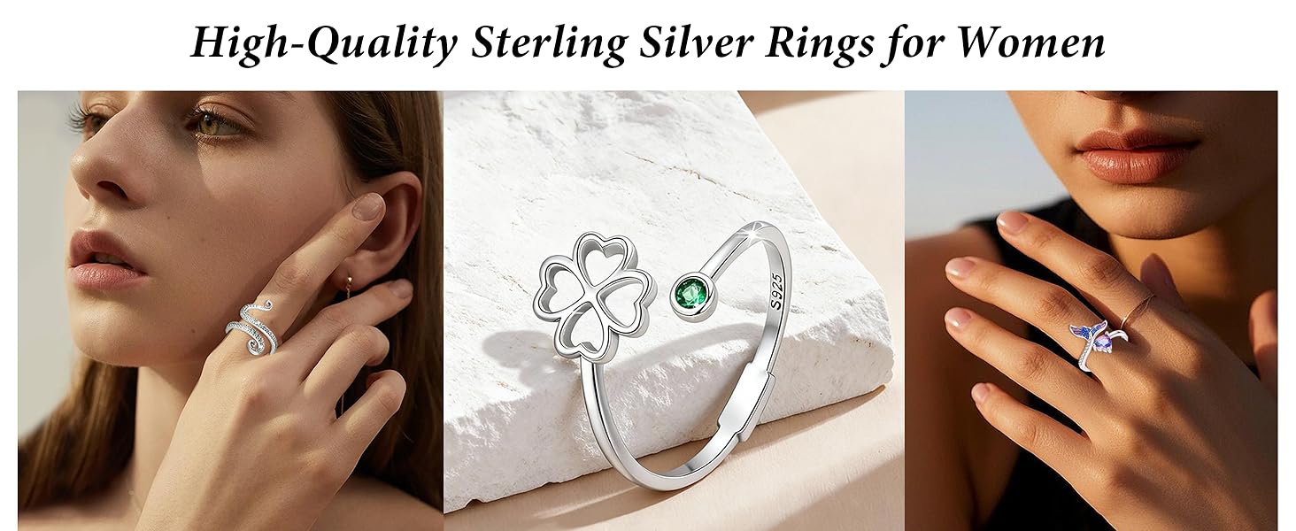 • خواتم الاصبع للنساء: هذه المجموعات من الخواتم الفضية بأشكال مختلفة، يمكن للمرأة ارتدائها لحضور العديد من المناسبات. مناسبة كمجوهرات للزوجة أو الأصدقاء أو الأقارب. عبر عنها عن حبك واهتمامك وأضفي الجمال والسحر عليها