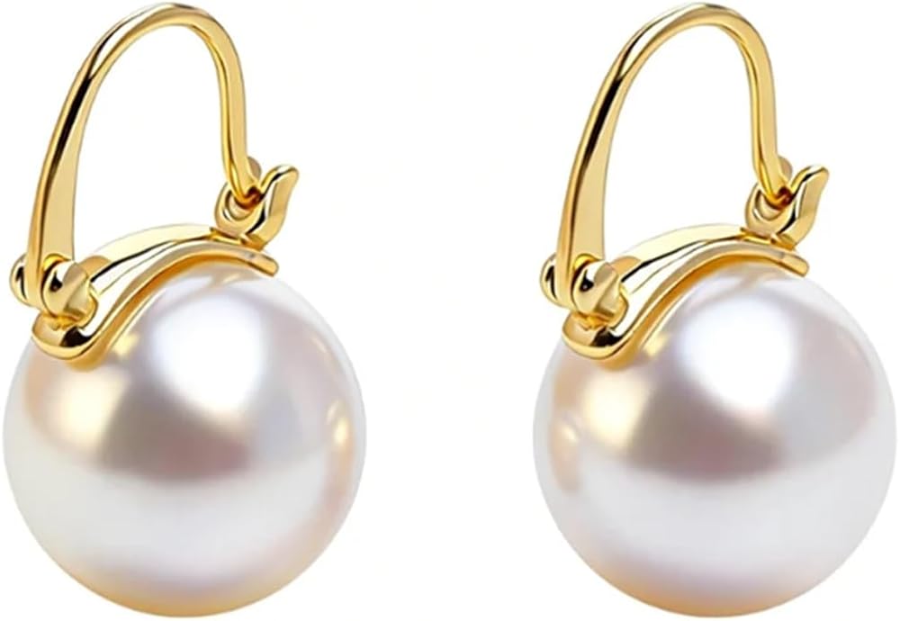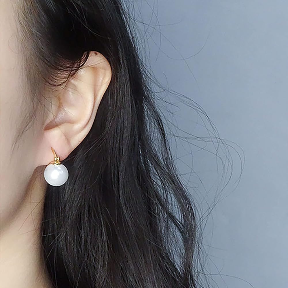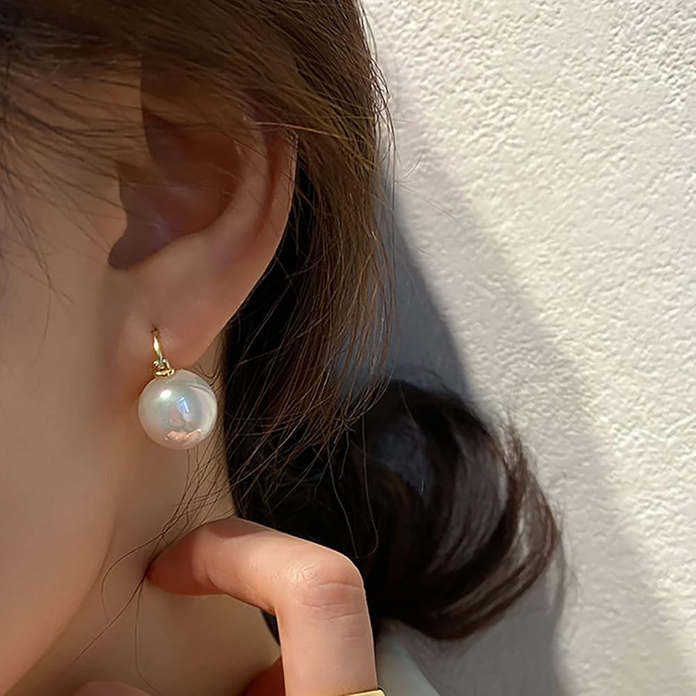 Simulated Shell Pearl Drop Earrings : Beautiful gold hoop dangle earrings with 12mm white shell pearl. Pearl earrings with dainty gold plated leverback, it's elegant and noble. Wearring these gold drop earrings, you will be the most shiny person in the crowd.