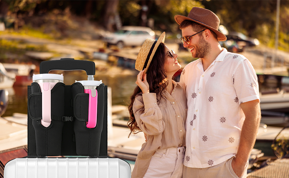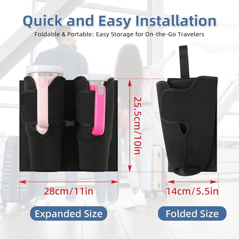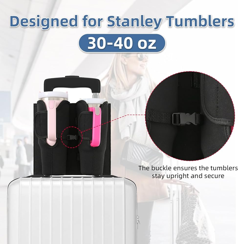 حامل أكواب الأمتعة للحقائب، متوافق مع أكواب ستانلي 30-40 أونصة، حامل أكواب الأمتعة قابل للطي مع جيب للهاتف والتذاكر، ملحق سفر مقاوم للماء بدون استخدام اليدين