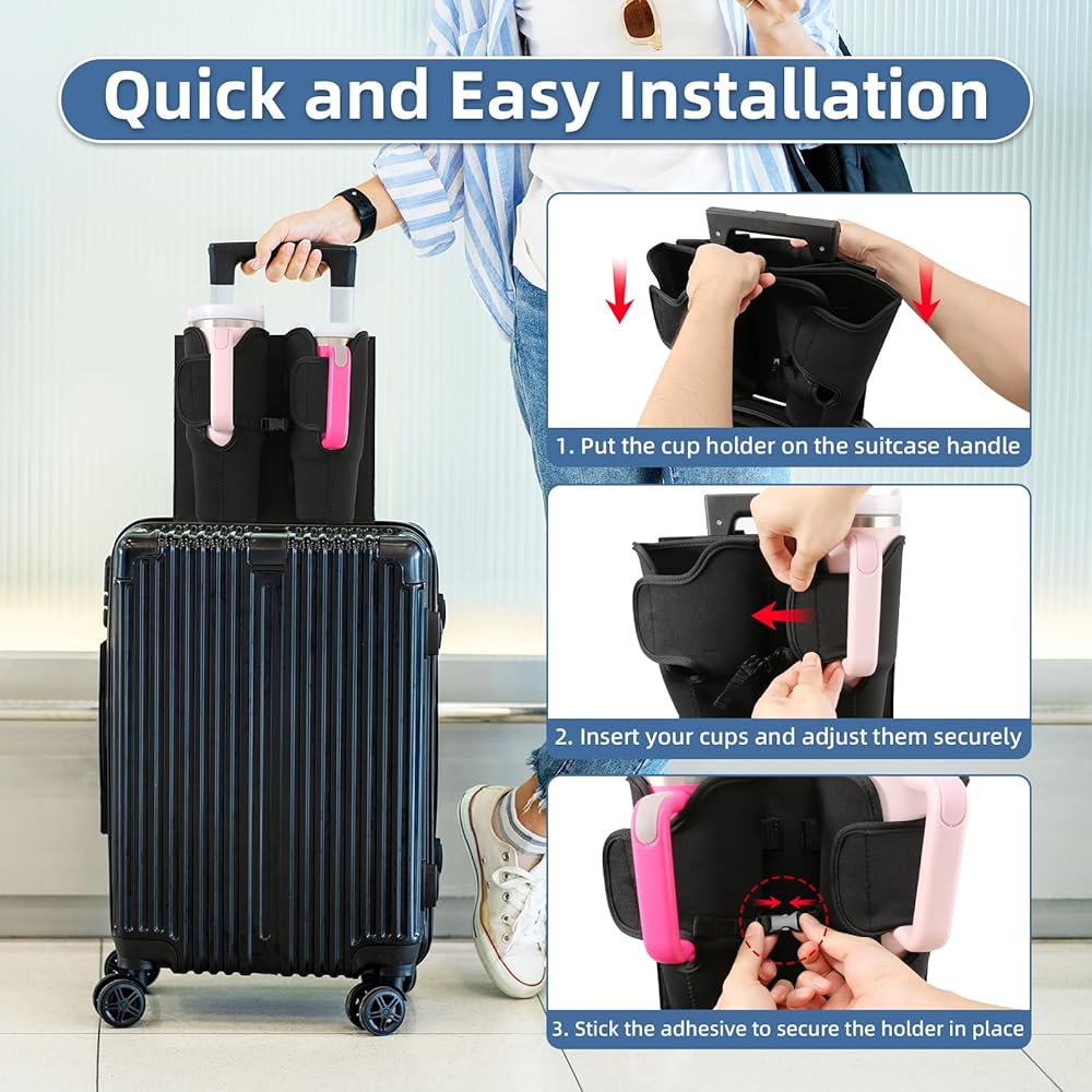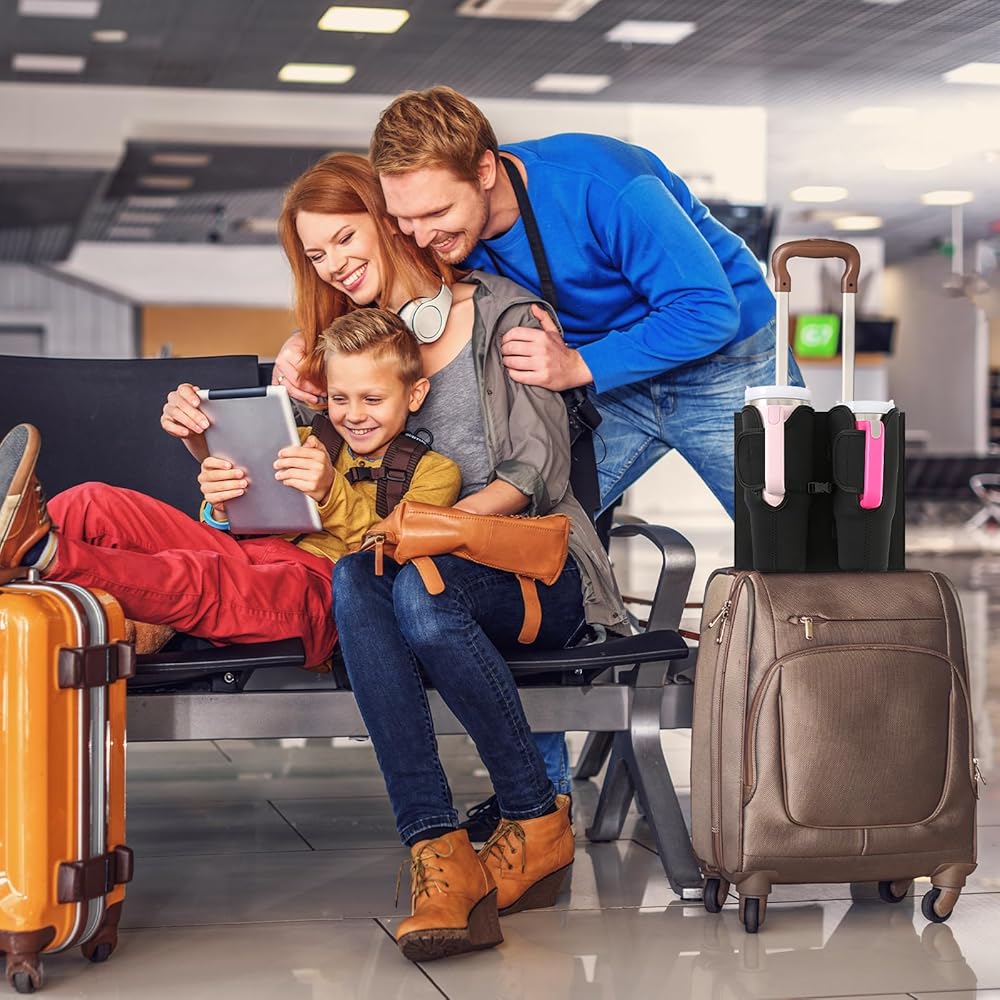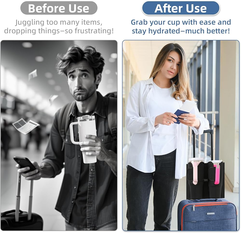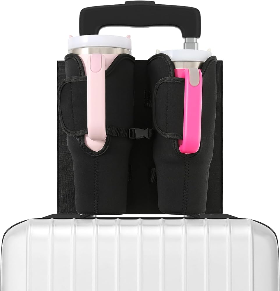 ترطيب بدون استخدام اليدين: حافظ على المشروبات آمنة باستخدام حامل أكواب للأمتعة الذي يتم تثبيته بسرعة على مقابض الحقيبة - حرر يديك أثناء السفر.