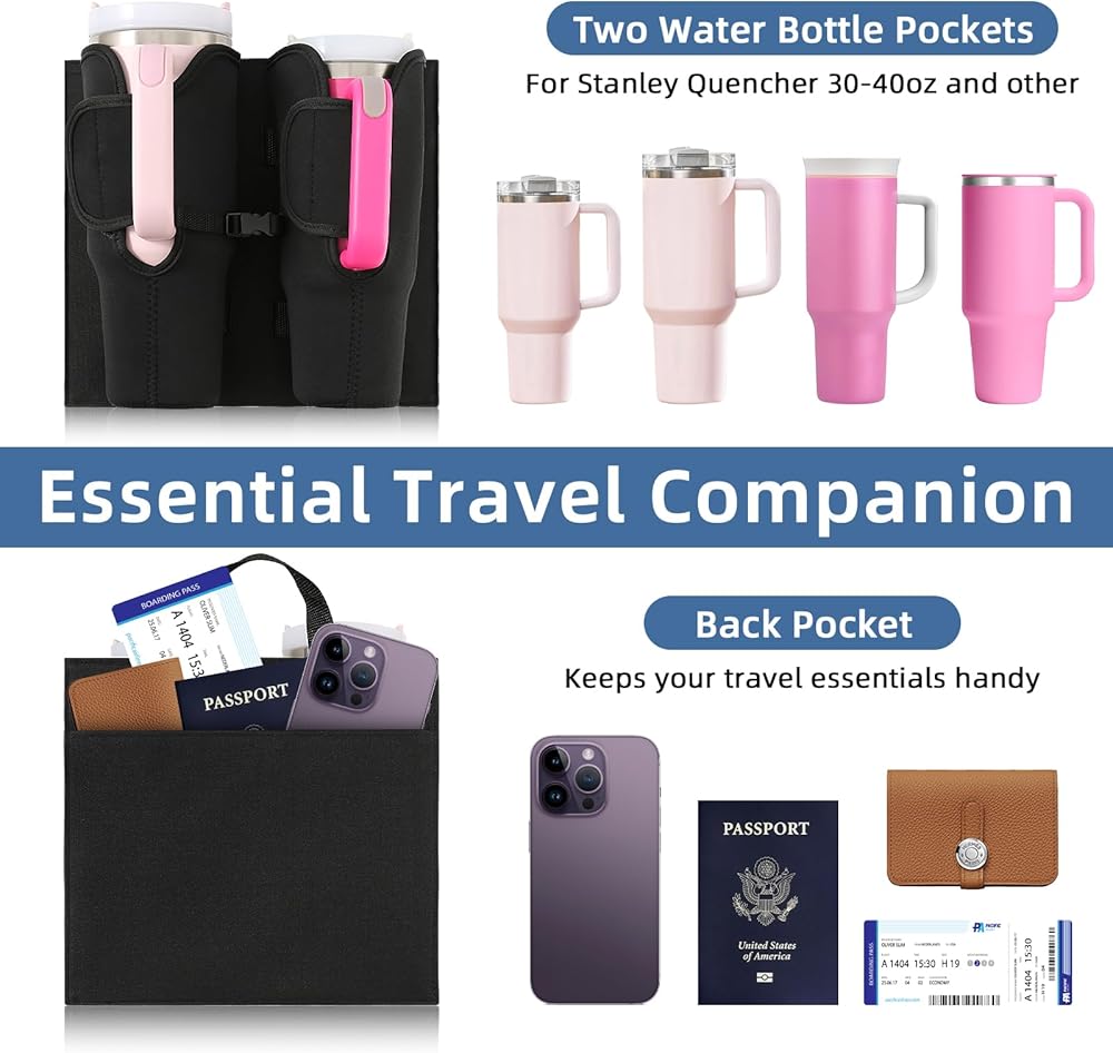 التخزين الذكي: أكثر من مجرد حامل مشروبات - يشتمل حامل الأكواب في حقيبة السفر هذا على جيب خلفي للهاتف وبطاقة الصعود إلى الطائرة والبطاقات للبقاء منظمًا.