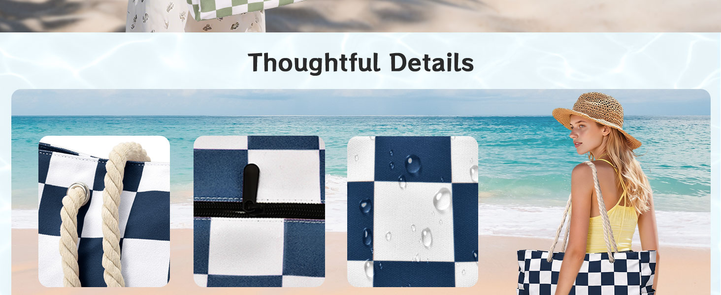 حقائب الشاطئ مقاومة للماء والرمال: مصنوعة من قماش كتاني مقاوم للماء فريد من نوعه، ثبت أنها أكثر متانة وخفيفة الوزن من حقائب السفر العادية. تتحمل حقيبة الشاطئ هذه رذاذ البحر وتمنع الرمال الناعمة من الدخول بشكل فعال، مما يحافظ على المحتويات جافة ونظيفة