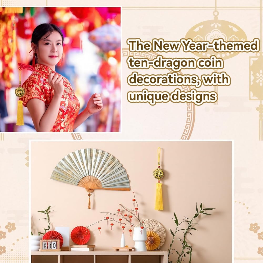 Unique Design:This Ten Emperors' Coins New Year decoration adopts the unique design of ancient Chinese coins, with simple and elegant yellow tassels, which is very representative of the beautiful meaning of the traditional Chinese New Year and the longing for a better New Year.