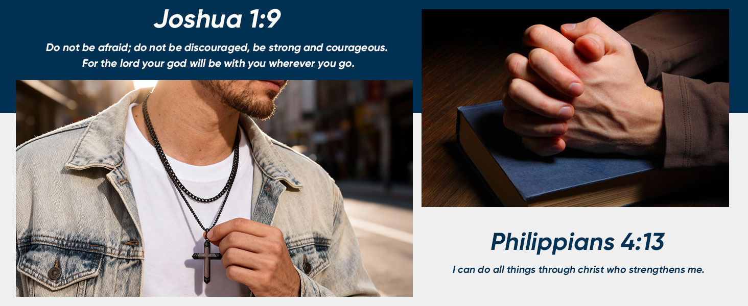 ☀ 【الإيمان المسيحي】قلادة متقاطعة من الكتاب المقدس - كونك رجل الله هو دعوة عالية يجب أن يطمح إليها الرجال المسيحيون. آية مسيحية قوية عن القوة والمثابرة. ملهمة! تتميز القلادة بنقش محفور بعمق لآية الكتاب المقدس الرائعة من جوشوا 1: 9: "كن قويًا وتشجع. لا تخف، لا تثبط، لأن الرب إلهك سيكون معك أينما ذهبت.