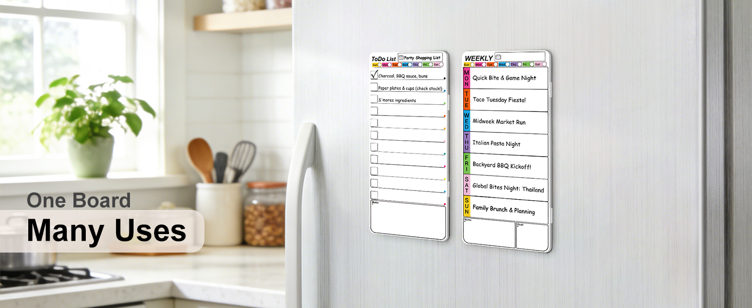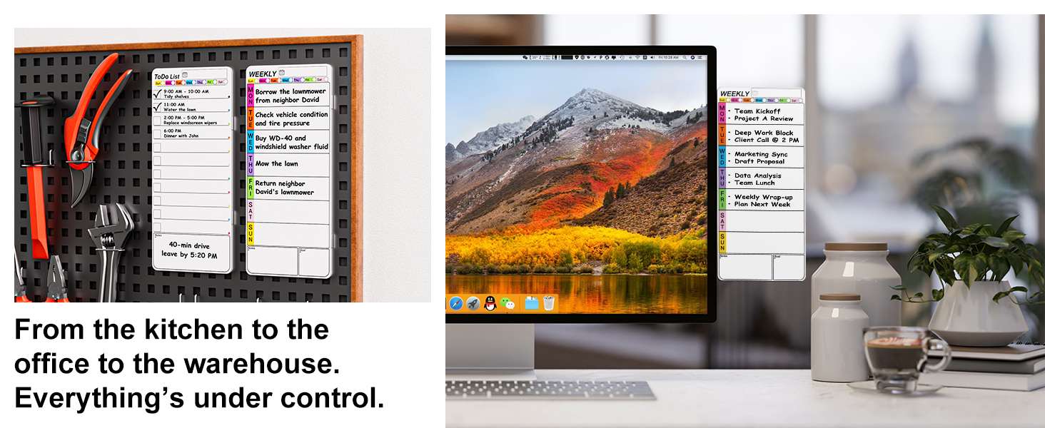 [منظم متعدد الأغراض للمنزل والمكتب والمدرسة]: - إدارة المهام، وتتبع المواعيد النهائية، وتبادل الأفكار، أو ترك تذكيرات سريعة. تعد لوحة المذكرات ذات السبورة البيضاء مثالية لتعزيز التنظيم والإنتاجية في أي مكان