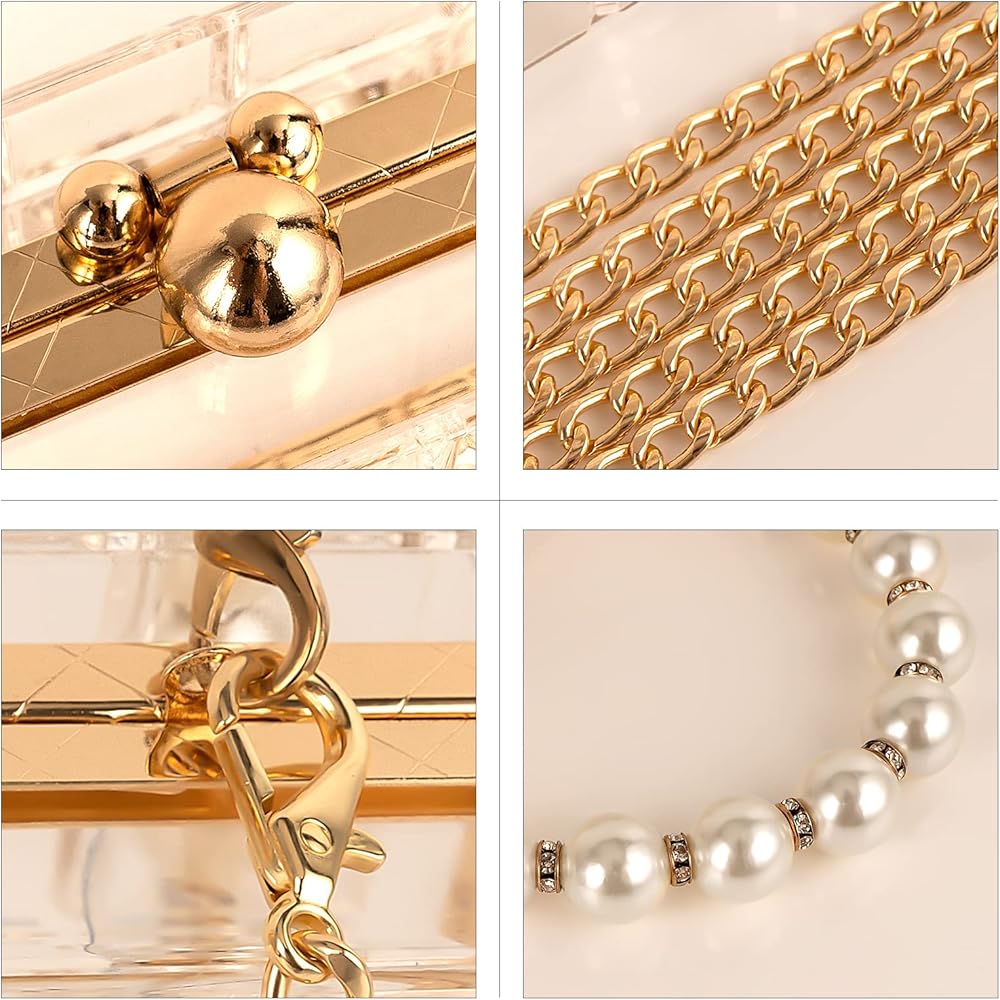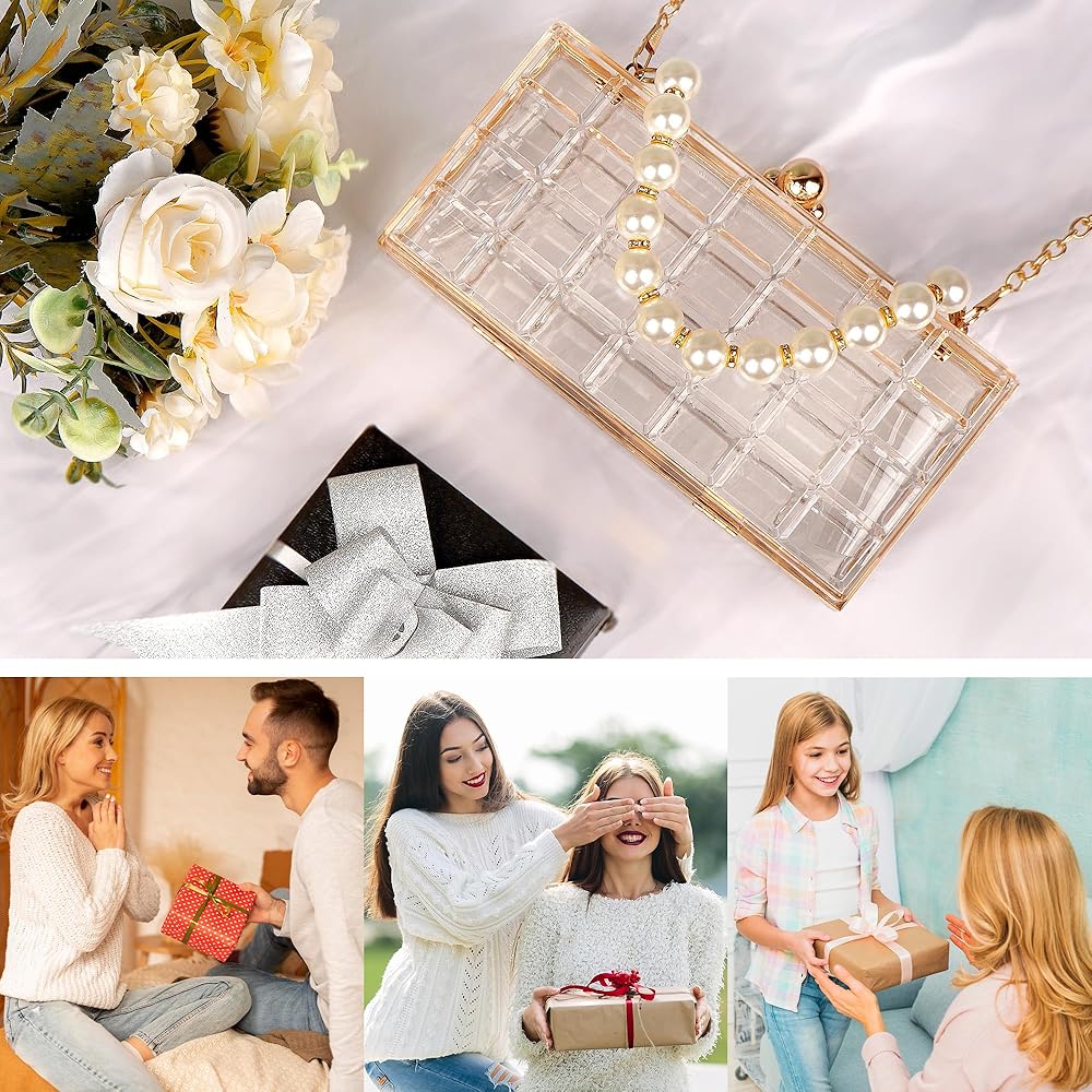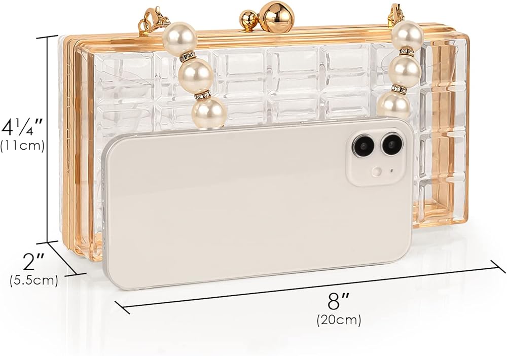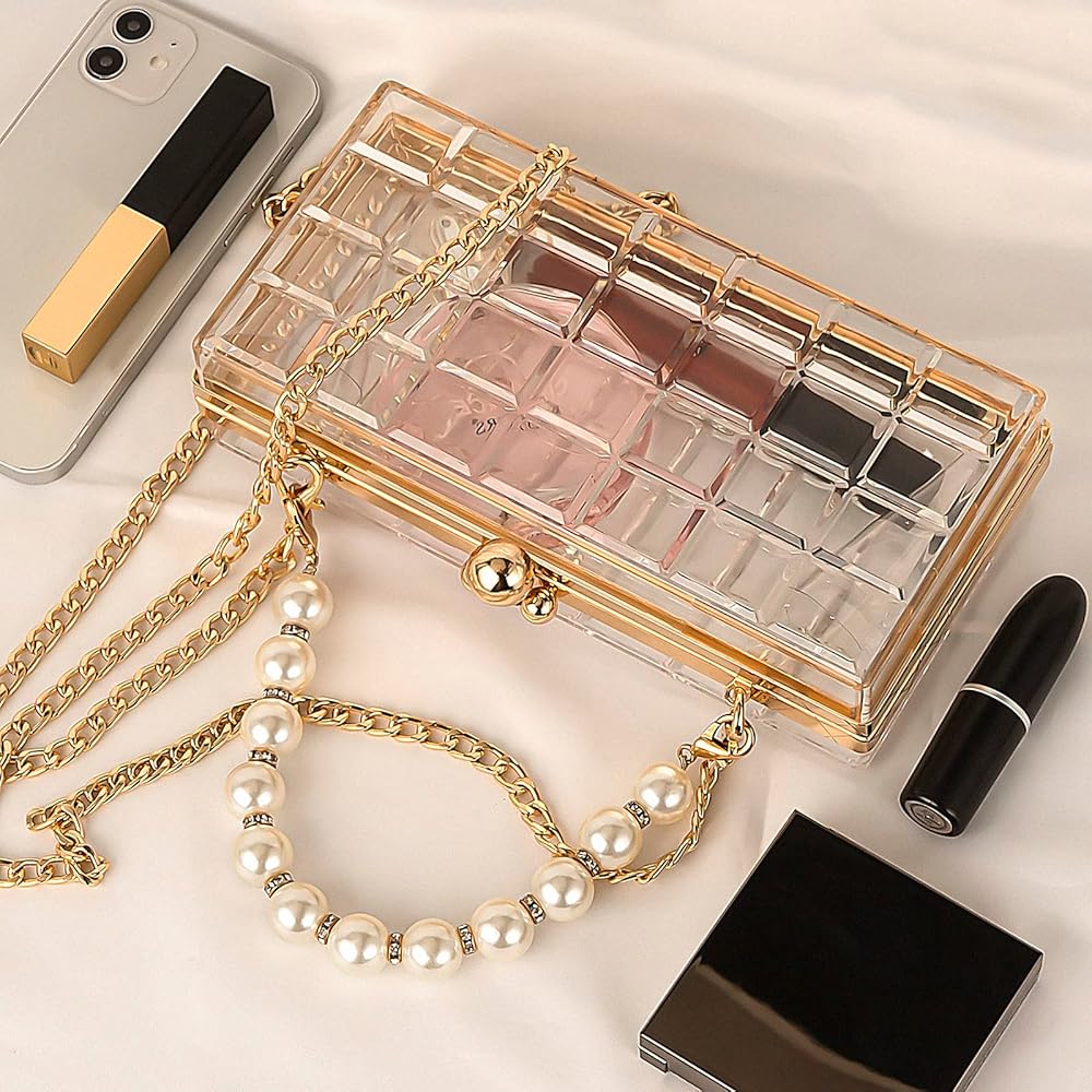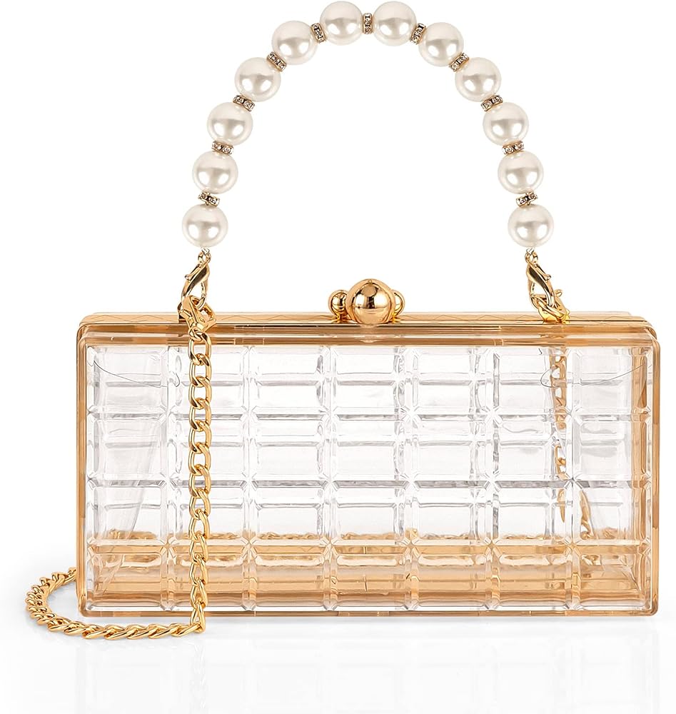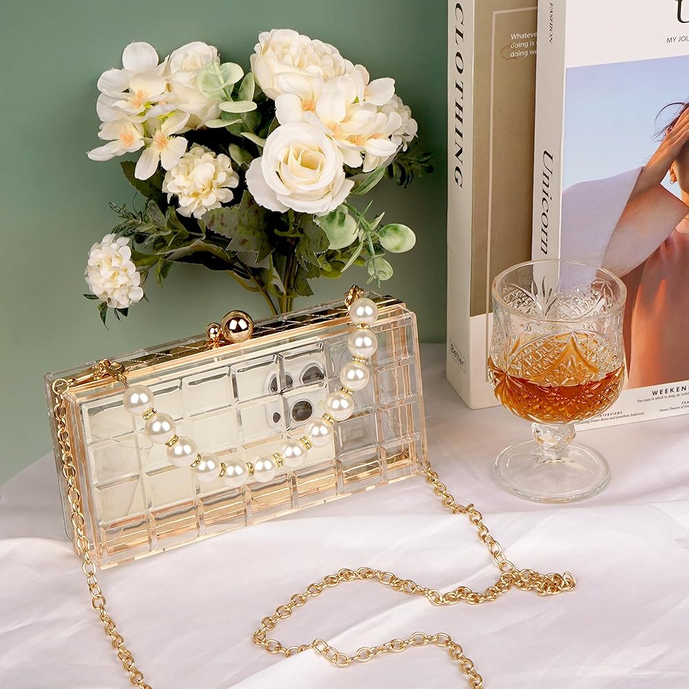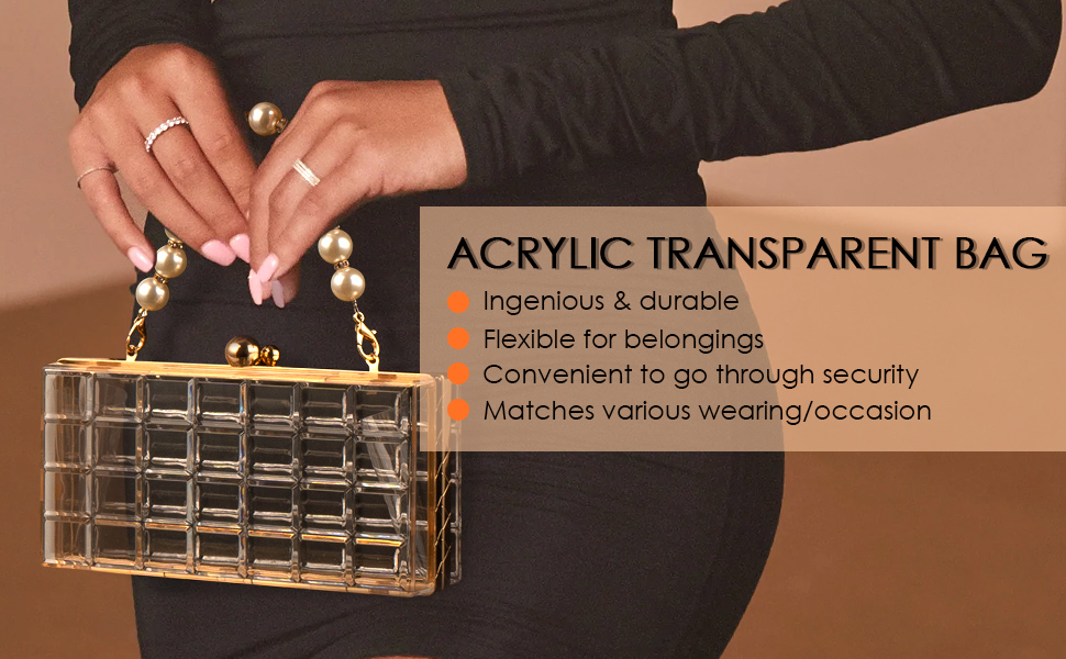 تصميم شفاف أنيق: يتميز بجسم أكريليك شفاف مع مقبض لؤلؤي أنيق. هذه الحقيبة الشفافة تكمل أي زي لحفلات الزفاف، والحفلات الراقصة، والحفلات المسائية.