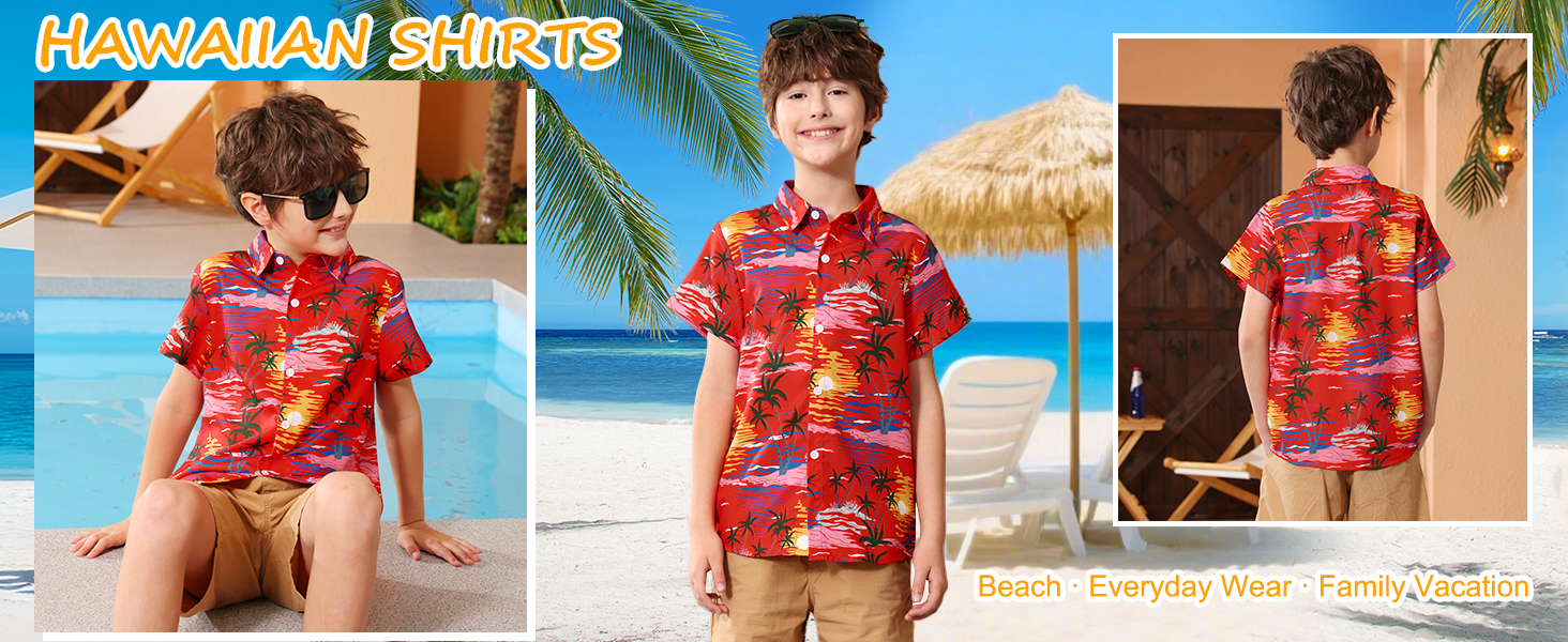 مثالي للمناسبات الصيفية: قميص استوائي للأولاد مثالي للعطلات الصيفية ورحلات الشاطئ والمخيمات وحفلات الشواء والتجمعات العائلية والحفلات على طراز هاواي والملابس اليومية غير الرسمية. مصمم للأولاد الذين تتراوح أعمارهم بين 5 و14 عامًا، ويوفر الراحة والأناقة الصيفية