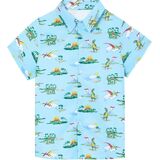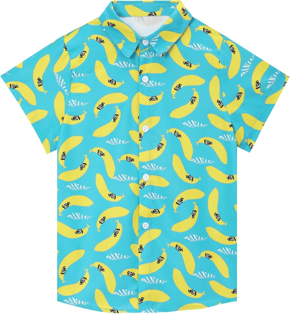 مطبوعات استوائية ممتعة وعصرية ونابضة بالحياة: قمصان هاواي للأولاد مصممة بأنماط صيفية ممتعة مثل غروب الشمس والشاطئ والموز وجوز الهند والأناناس والغابات المطيرة وطيور النحام والبط والديناصور والمراكب الشراعية وأوراق أشجار النخيل وزهور الزهور الاستوائية. تضيف الألوان الزاهية والمطبوعات المضحكة والمرحة أجواء الجزيرة النابضة بالحياة إلى أي ملابس صيفية