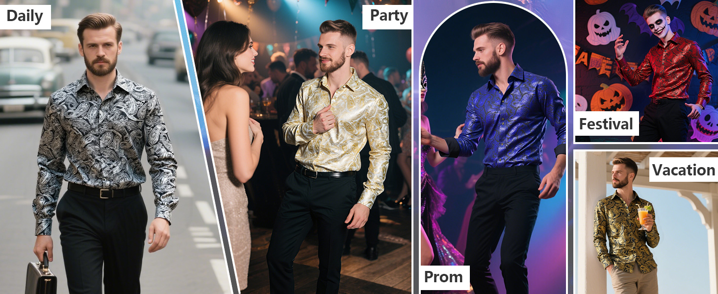 يجسد القميص جمالية الموضة في السبعينيات، ويتميز بأكمام طويلة، وياقة واسعة بأزرار سفلية، وأنماط بيزلي كلاسيكية أنيقة. إنه مناسب بشكل مثالي للأفراد الذين يقدرون ثقافة السبعينيات ويستمتعون بالمشاركة في الحفلات والمناسبات ذات الطابع الخاص