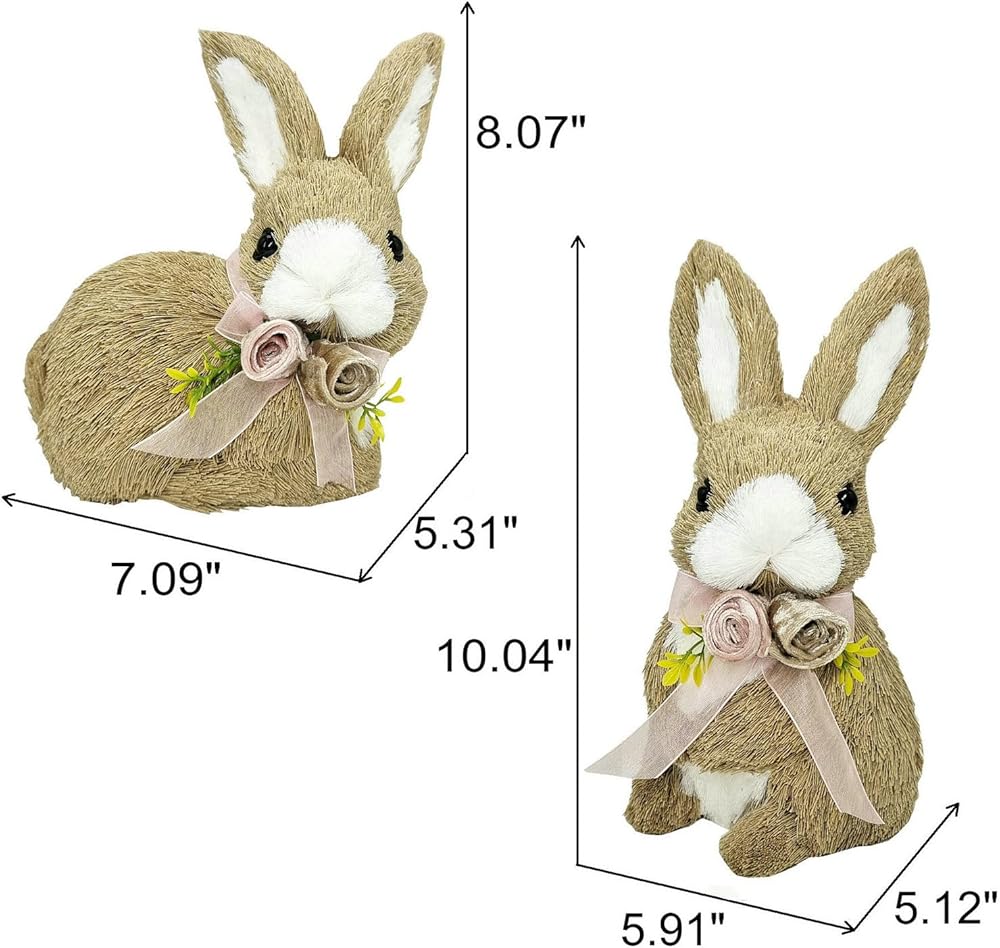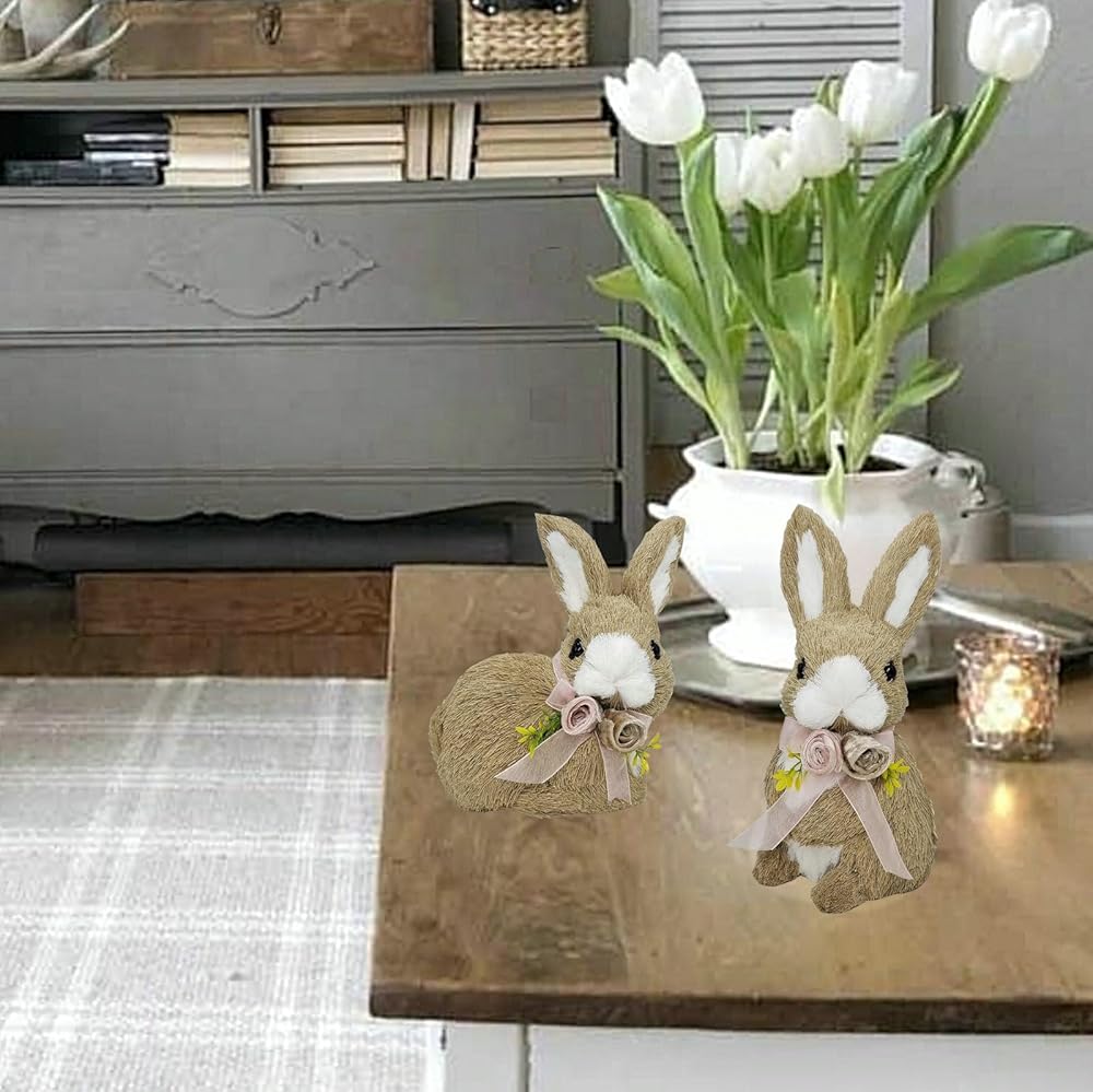 [ما تحصل عليه] سوف تحصل على 2 أرنب عيد الفصح الرائع للغاية. إنها مصنوعة يدويًا تمامًا من مواد طبيعية، مع فيونكة من الزهور والشريط، ستكون ديكورات عيد الفصح الرائعة