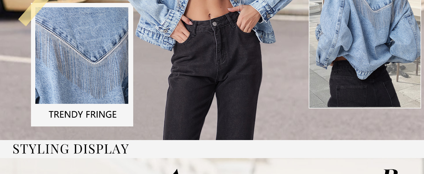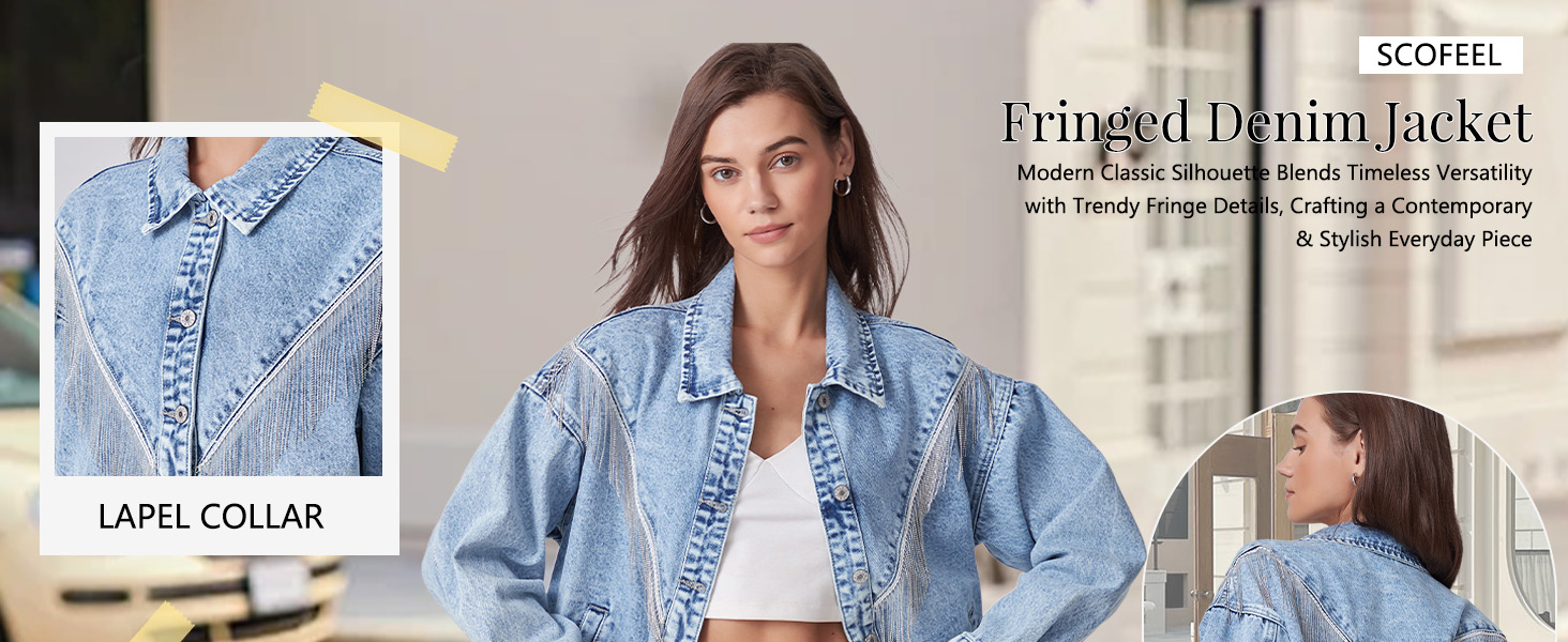 تصميم فريد: سترة الدنيم ذات الشرابة مع شراشيب مطرزة، نمط غسيل متعثر، جيبان جانبيان لليدين، ياقة مطوية إلى الأسفل، أكمام طويلة مع أساور بأزرار ومظهر عصري لملابس الشارع يبرز في كل حشد.