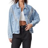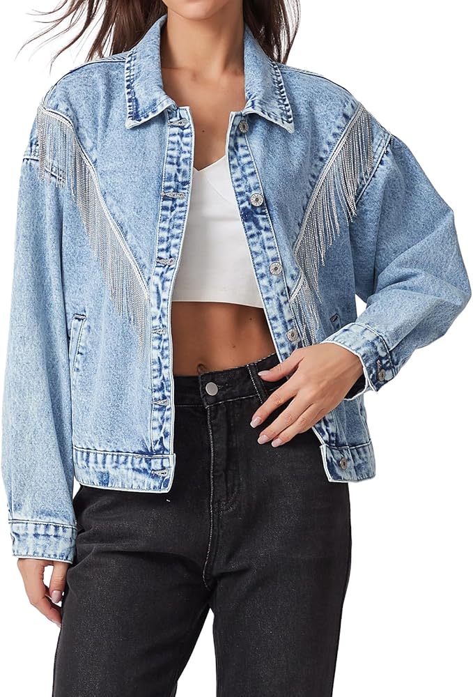 خامة فاخرة: هذا الجاكيت النسائي ذو الشراشيب المعدنية اللامعة مصنوع من نسيج الدنيم عالي الجودة، ناعم لكنه متين، مسامي ومريح للارتداء اليومي، مما يوفر نمطًا يدوم طويلاً وسهولة الحركة.