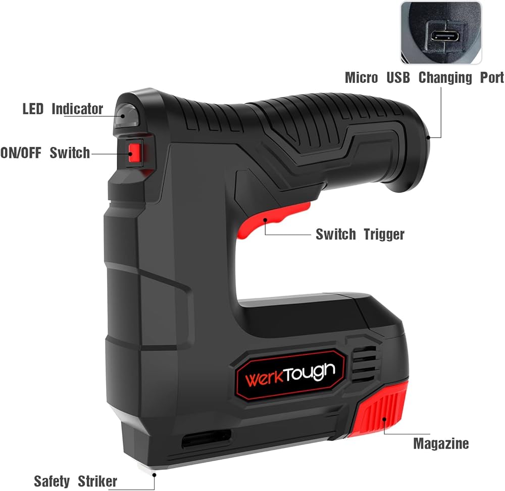 إصدار 2 في 1 مثالي يمكنك تركيبه بنفسك، مناسب للدبابيس 6-10 ملم ومسامير براد 10 ملم، مناسب لجميع أنواع التحسينات المنزلية والسجاد وإصلاح الجلد والهوايات التي تصنعها بنفسك. تصويب عالي السرعة، 60 قطعة في الدقيقة، خفيف الوزن وتصميم مريح مع قبضة ناعمة، مما يتيح تجربة عمل جيدة ومريحة ومبهجة.