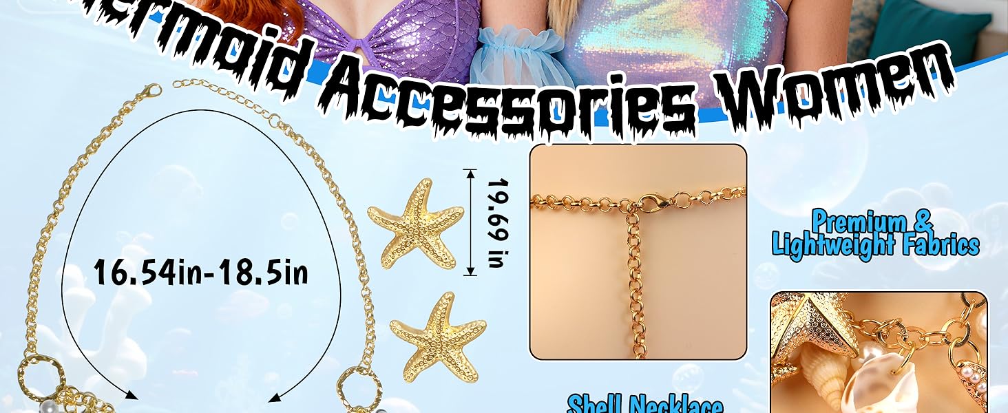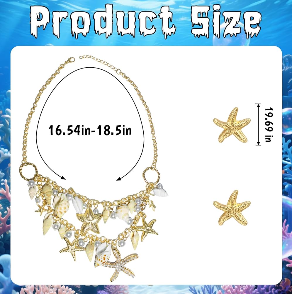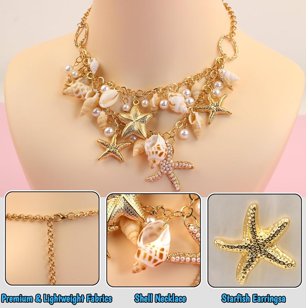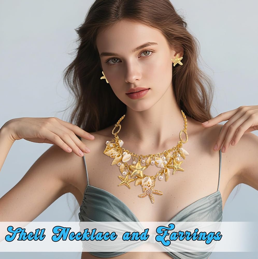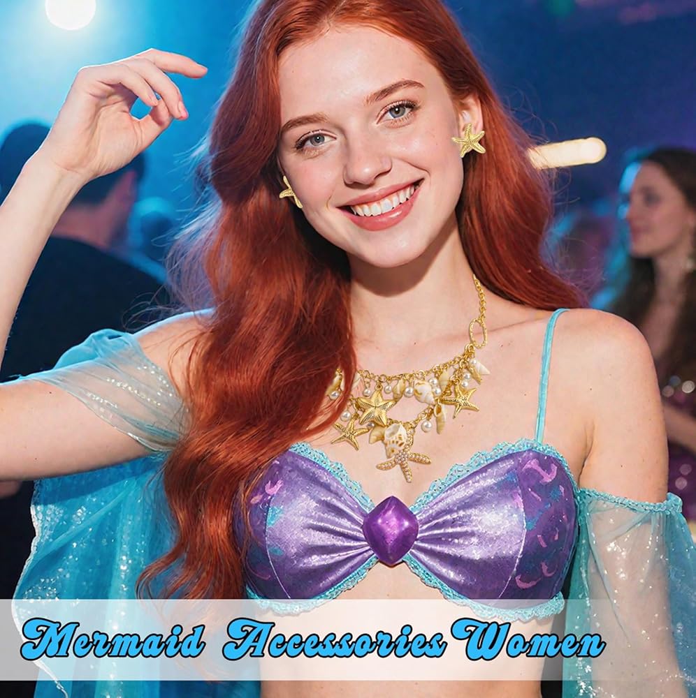 إكسسوارات زي حورية البحر للنساء: أكمل مظهر زي حورية البحر الخاص بك مع مجموعة قلادة الصدف وأقراط نجم البحر - مثالية لحفلات الهالوين وحفلات الشاطئ والملابس ذات الطابع الخاص.
