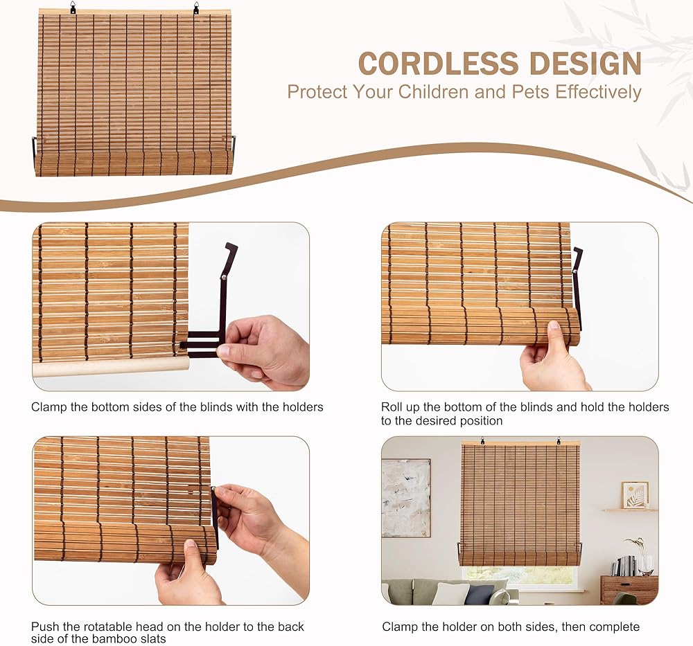 【تصميم بدون أسلاك】 بعد مئات الاختبارات، يجعل نظام الرفع اللاسلكي المبتكر ستائر النوافذ الطبيعية أكثر أمانًا. التصميم اللاسلكي يحمي أطفالك وحيواناتك الأليفة بشكل فعال. تم تجهيز الستائر الدوارة المصنوعة من الخيزران اللاسلكية بحامل على شكل حرف F، والذي يمكن أن يساعدك على لف الستائر إلى أي ارتفاع، مما يوفر المساحة مع الحفاظ على المظهر الجميل.