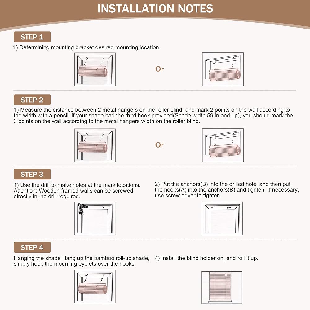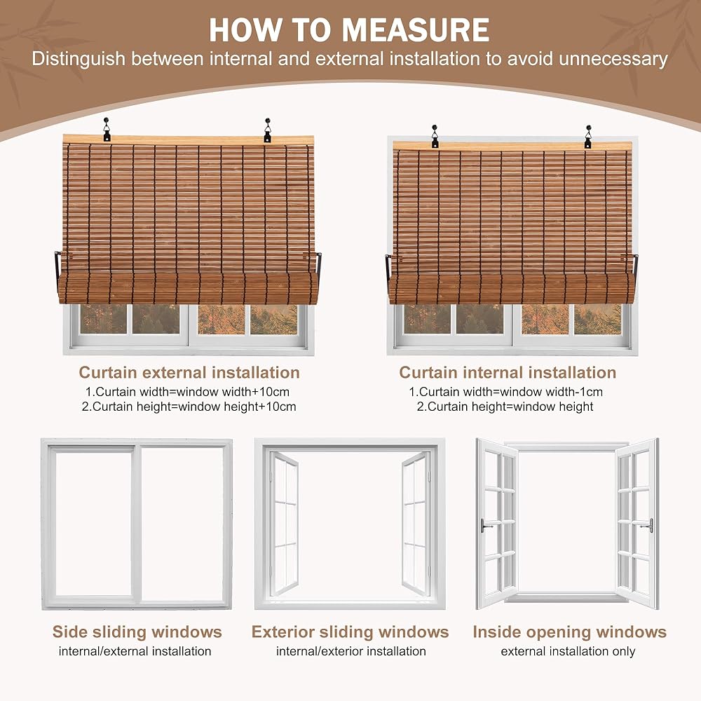 【حجم المنتج والتركيب】 طول الستائر: 72 بوصة؛ عرض الستائر: 24-72 بوصة، إجمالي 8 مقاسات. تأتي الستائر الدوارة المصنوعة من الخيزران اللاسلكية مع مجموعة كاملة من ملحقات التثبيت وتعليمات مفصلة للتثبيت السريع. بالنسبة للتركيب الداخلي، يجب أن يكون عمق إطار النافذة 2 بوصة على الأقل، ويجب أن يكون عرض الستائر المصنوعة من الخيزران أقصر من عرض النافذة بمقدار 1/4 بوصة على الأقل
