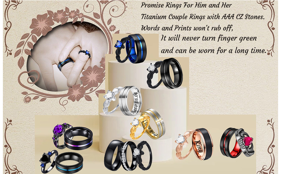 الخطوات المخصصة: ①اختر خواتم الأزواج / خواتم زفاف رجالي أرجوانية / أرجوانية خواتم زفاف للنساء ②ثم سترى علامة التبويب الصفراء "مخصصة الآن"، ③حدد مقاس الخاتم الرجالي (6-13) وحجم الخاتم النسائي (6-10)④يمكنك تخصيص الأسماء/التاريخ/النص في مجموعة خواتم الوعد الخاصة به ولها.