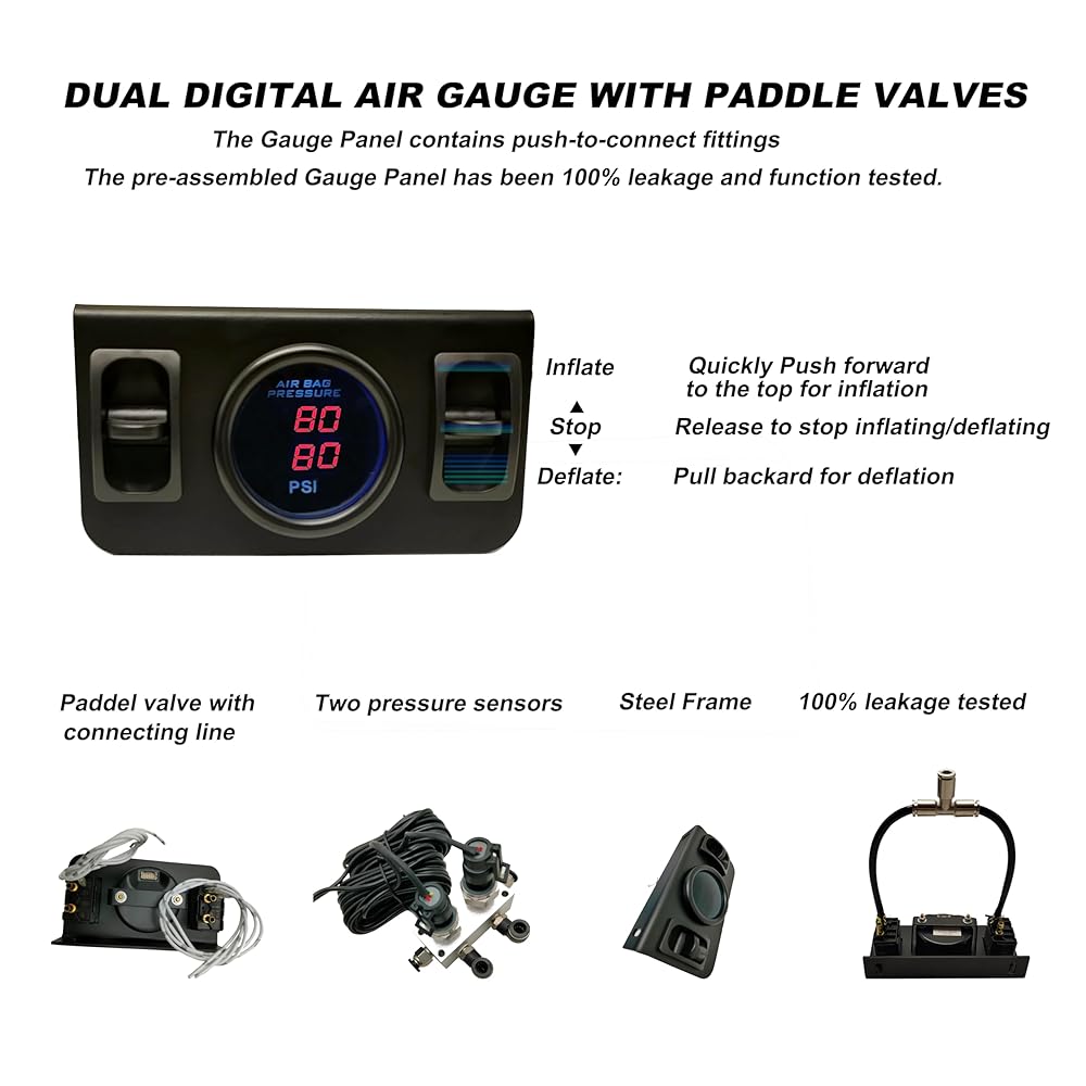 How to Use: The paddle valve can inflate and deflate two air springs seperately and the digital air gauge displays the air pressure synchronously, the system does not need an air tank and it can drive the compressor automatically when you push up the paddle valve to inflate.