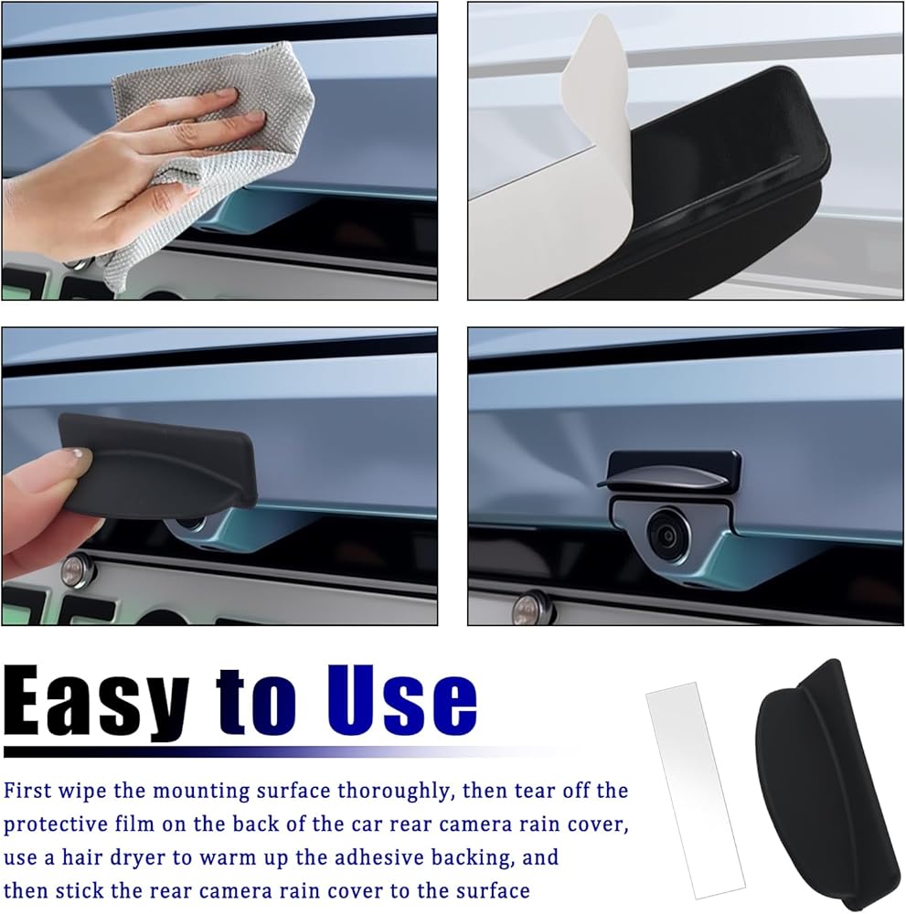 • Easy to Use: No need any professional tools, first wipe the mounting surface thoroughly, then tear off the protective film on the back of the car rear camera rain cover, use a hair dryer to warm up the adhesive backing, and then stick the rear camera rain cover to the surface
