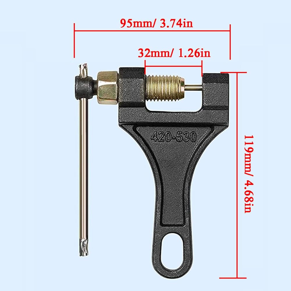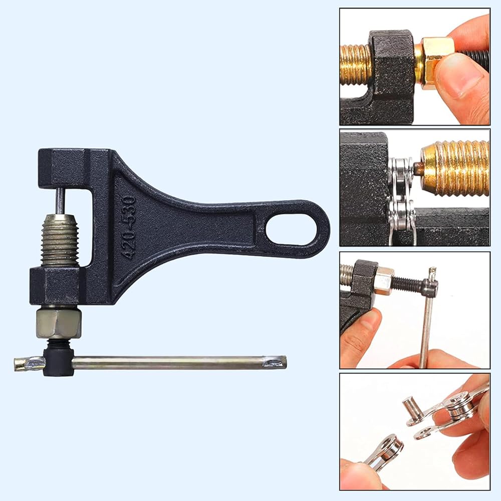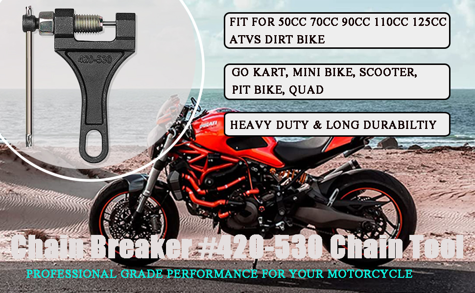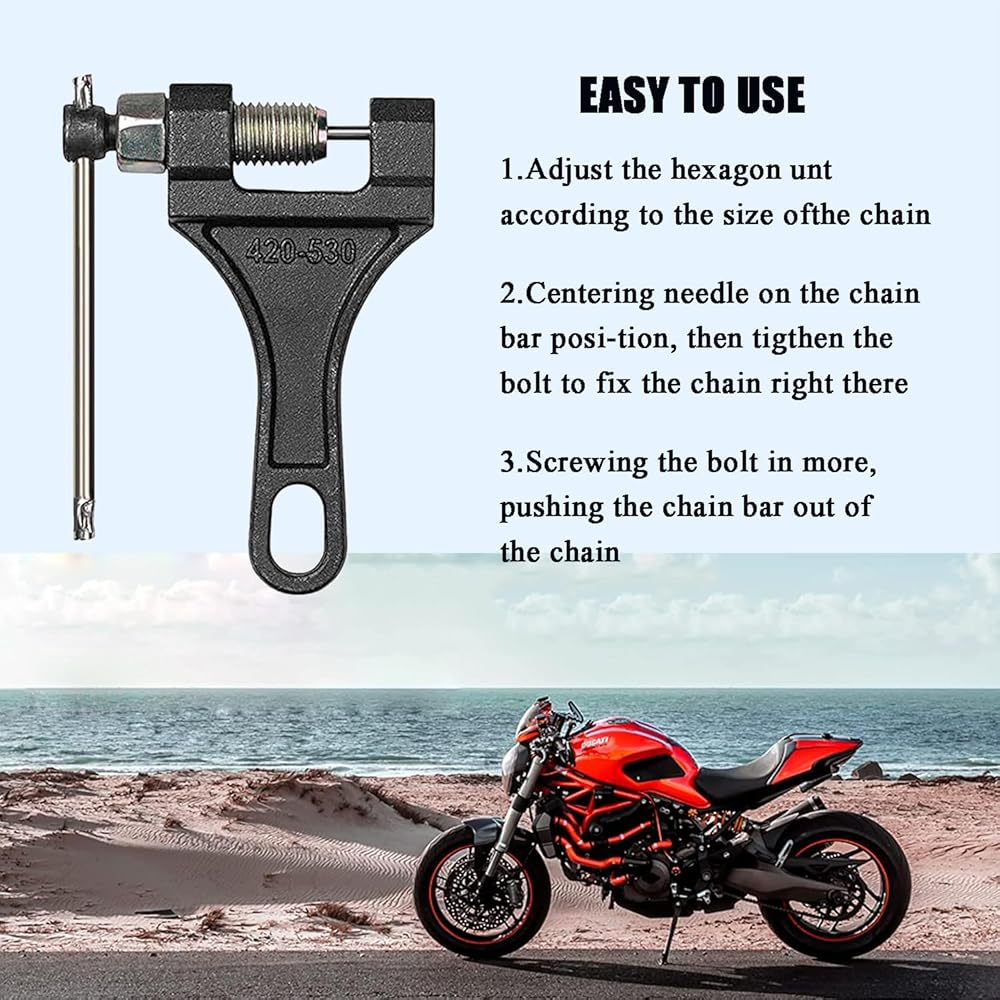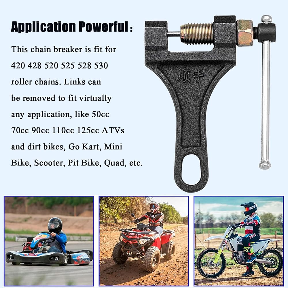 • 2️⃣ قاطع السلسلة هذا مناسب لسلاسل الأسطوانة 420 428 520 525 528 530. يمكن إزالة الروابط لتناسب أي تطبيق تقريبًا، مثل 50cc 70cc 90cc 110cc 125cc ATVs والدراجات الترابية، Go Kart، Mini Bike، Scooter، Pit Bike، Quad، إلخ.