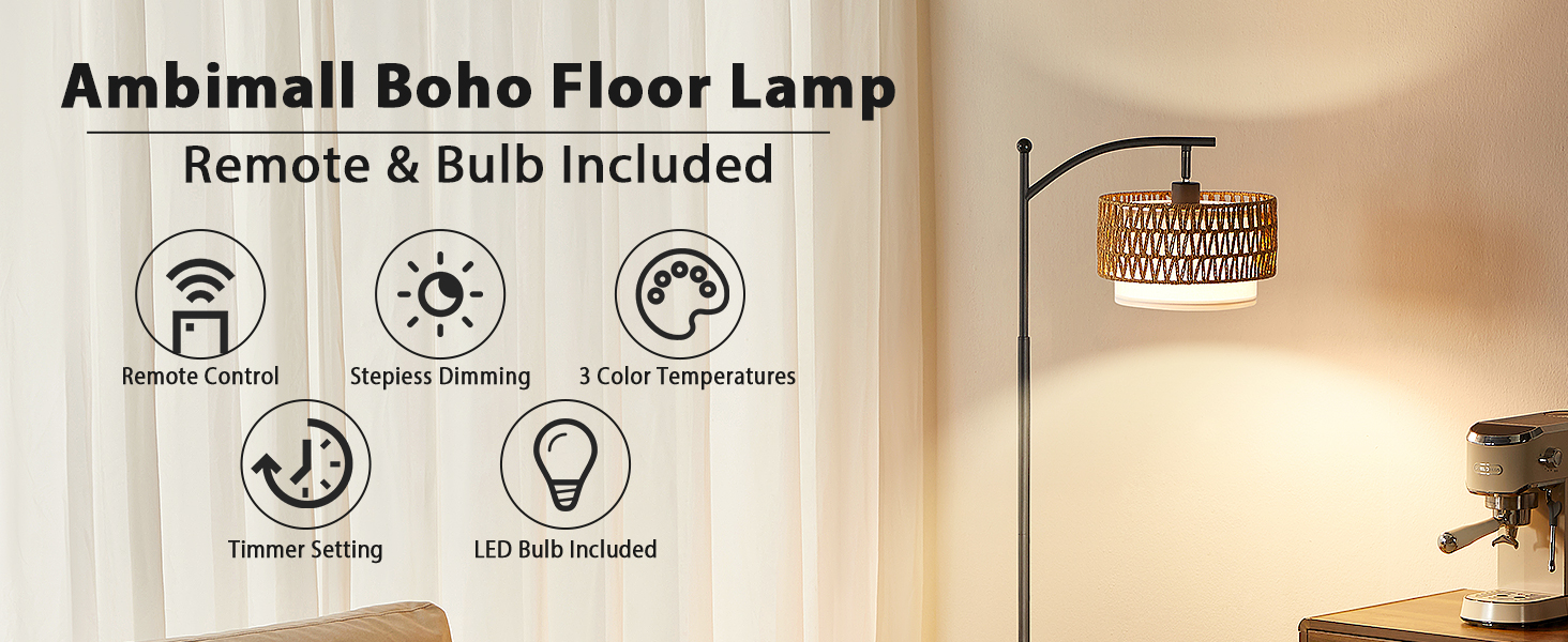 التعتيم ودرجة حرارة اللون: يأتي المصباح الأرضي البوهو الخاص بنا مزودًا بمصباح LED قابل للتعتيم بقدرة 9 وات والذي يتميز بتعديل السطوع بدون خطوات (من 15%-100%) ودرجة حرارة اللون (من 3000 كلفن إلى 6000 كلفن). اضغط على جهاز التحكم عن بعد لتغيير أجواء الغرفة. كما أنه يتميز بأوضاع محددة مسبقًا للقراءة والحضانة والعمل والإضاءة الليلية، مما يلبي جميع احتياجات الإضاءة الخاصة بك. ومجهز بوظيفة ذاكرة لتذكر آخر إعداداتك، وهو أمر مريح للغاية.