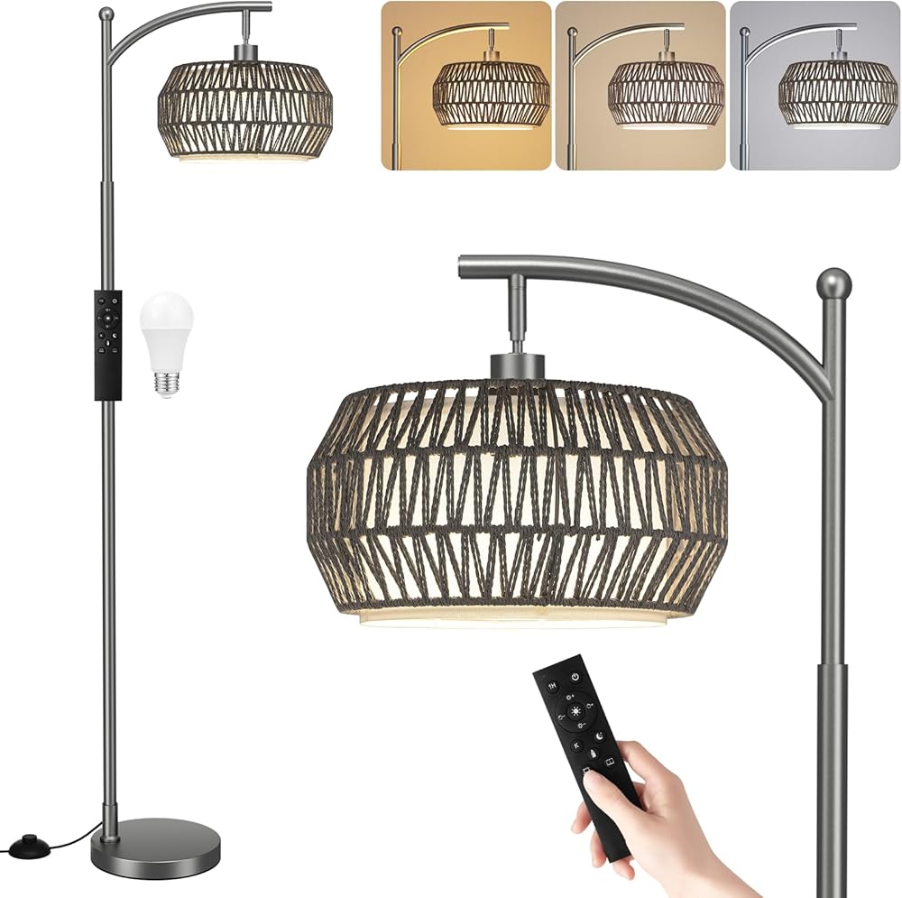 أغطية مصابيح مزدوجة من الروطان والكتان: مصباح أرضي على شكل قوس مزود بغطاءين مصباح قابلين للإزالة، وغطاء مصباح واحد مصنوع يدويًا من الروطان بنسبة 100%، وغطاء مصباح واحد من الكتان. سيحول المصباح الطويل ديكور منزلك إلى جو ريفي ومزرعة. قم بتحديث مظهر المصباح القائم بسهولة وقتما تشاء. يتلاءم المصباح الأرضي المقوس بشكل مثالي مع غرفة المعيشة أو غرفة النوم أو الزاوية أو المكتب ويشغل مساحة صغيرة جدًا وله مظهر بوهيمي عتيق.