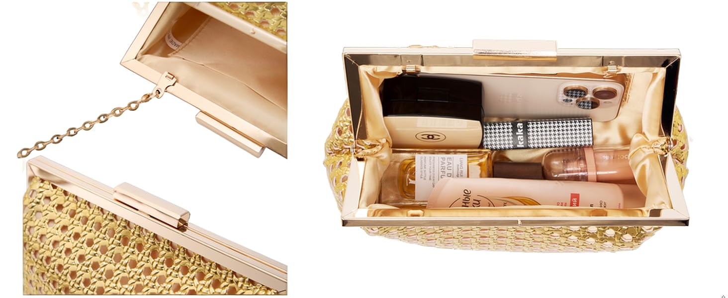 • تصميم واسع وعملي: بأبعاد 8 بوصة طول × 3 بوصة عرض × 5 بوصة ارتفاع، يوفر الجزء الداخلي مساحة واسعة لضرورياتك - الهاتف وأحمر الشفاه والمفاتيح والمحفظة الصغيرة. يحافظ إغلاق الإطار المعدني الأنيق على مقتنياتك آمنة ويضيف لمسة نهائية مصقولة.