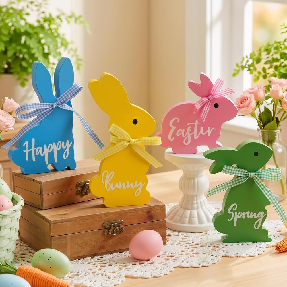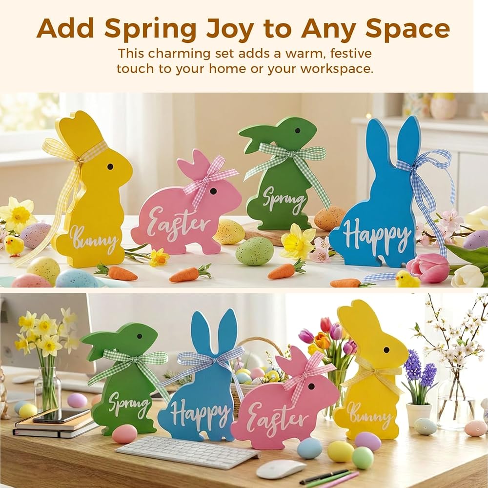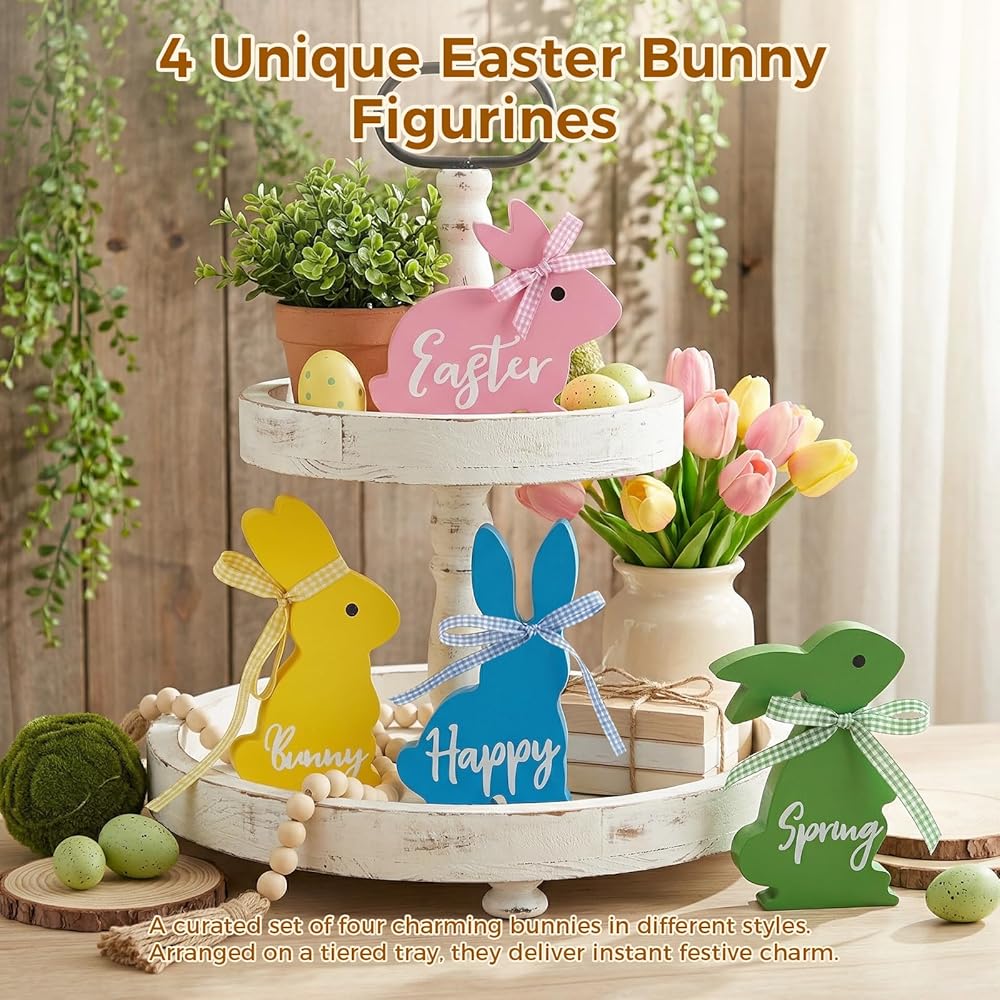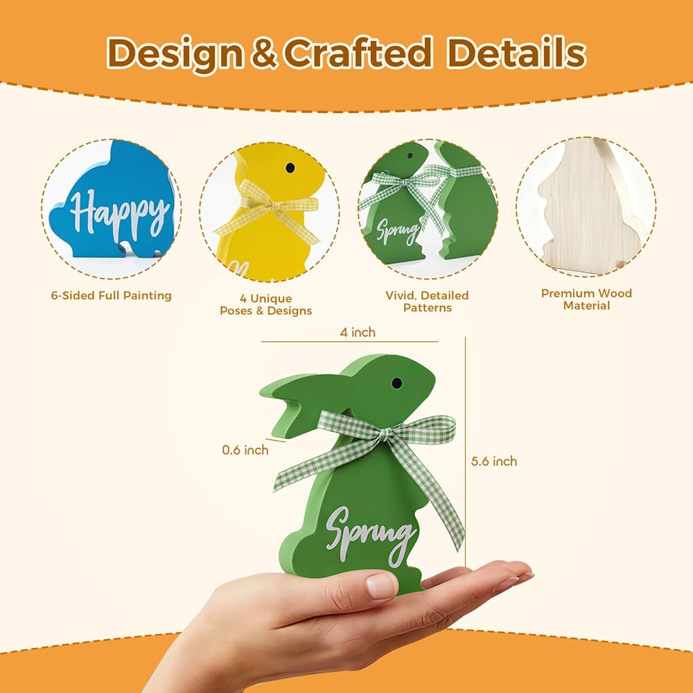 • زينة أرنب عيد الفصح اللطيفة: تخلص من المجموعات المتكررة! يتمتع كل من الأرانب الخشبية الأربعة لدينا بوضعية وشخصية مميزة، مما يخلق ديكورًا ديناميكيًا ونابضًا بالحياة لعيد الفصح يسرق العرض