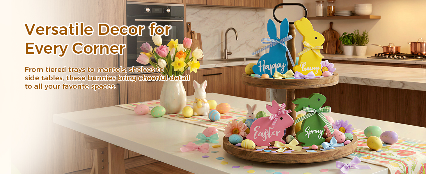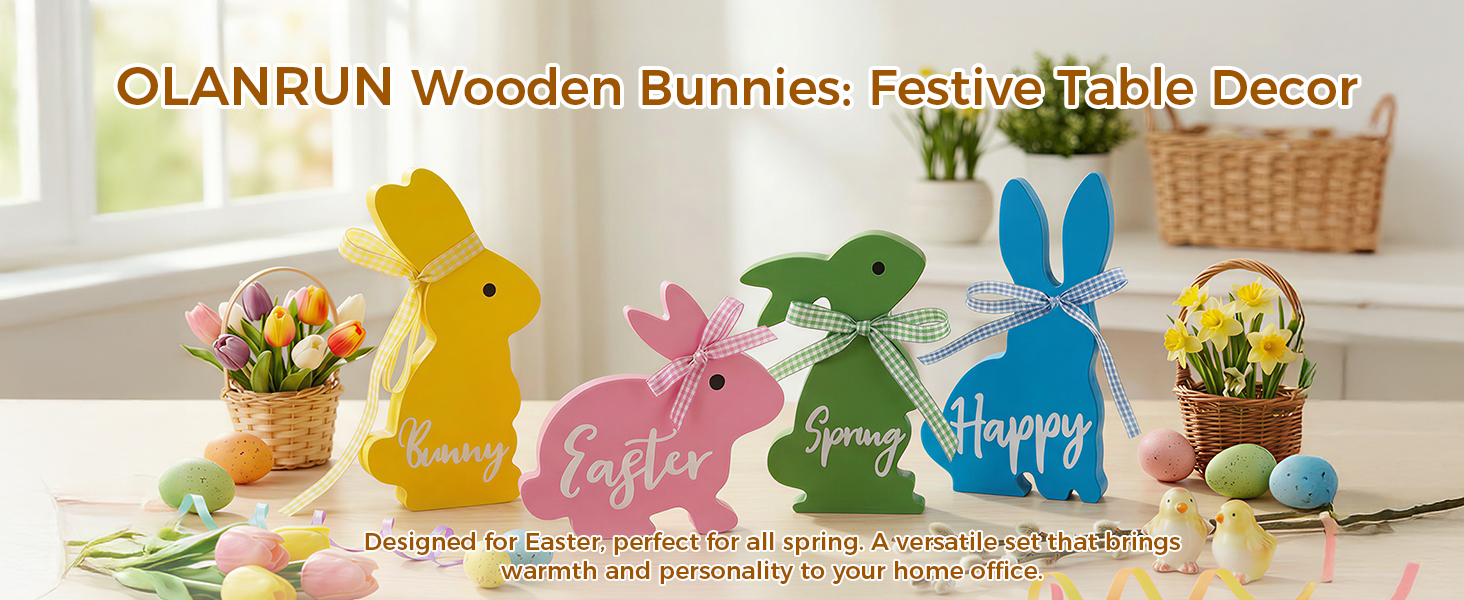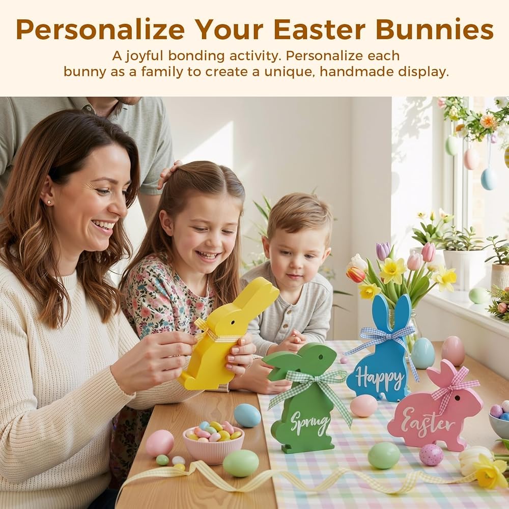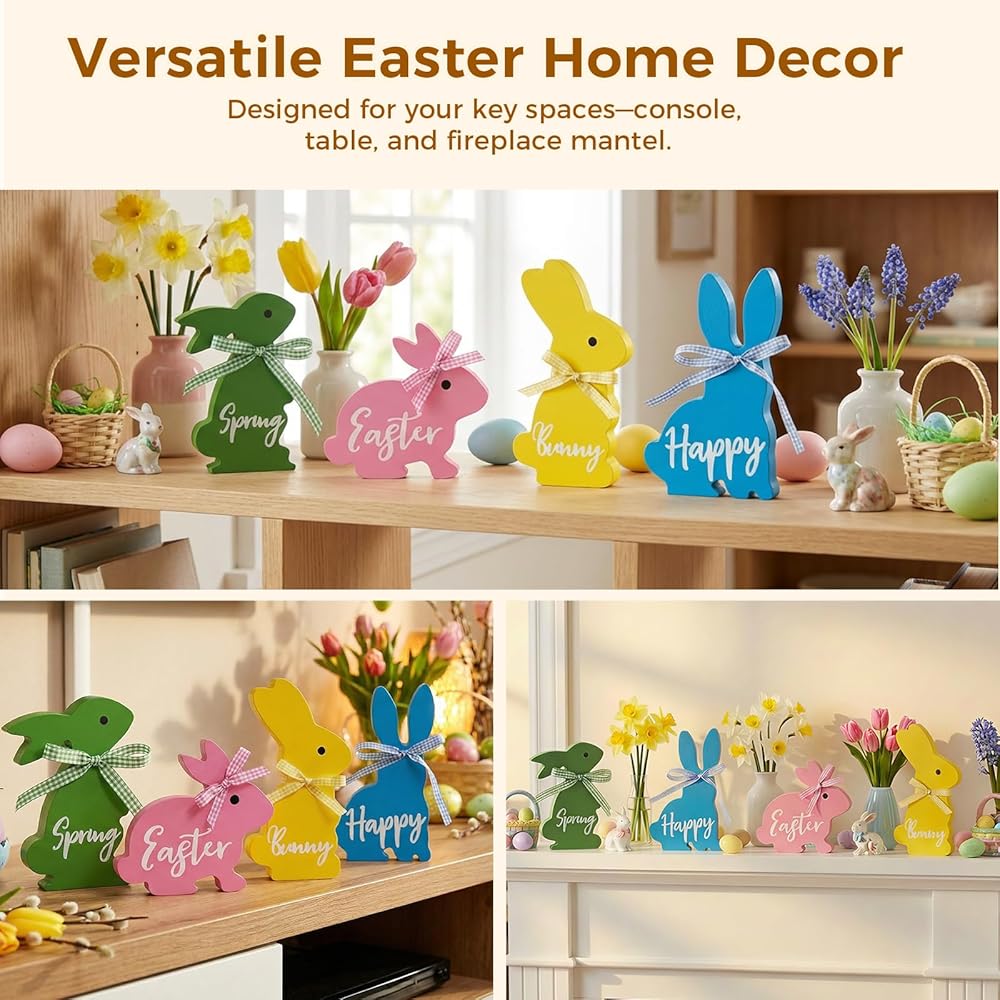 • زينة أرنب عيد الفصح اللطيفة: تخلص من المجموعات المتكررة! يتمتع كل من الأرانب الخشبية الأربعة لدينا بوضعية وشخصية مميزة، مما يخلق ديكورًا ديناميكيًا ونابضًا بالحياة لعيد الفصح يسرق العرض