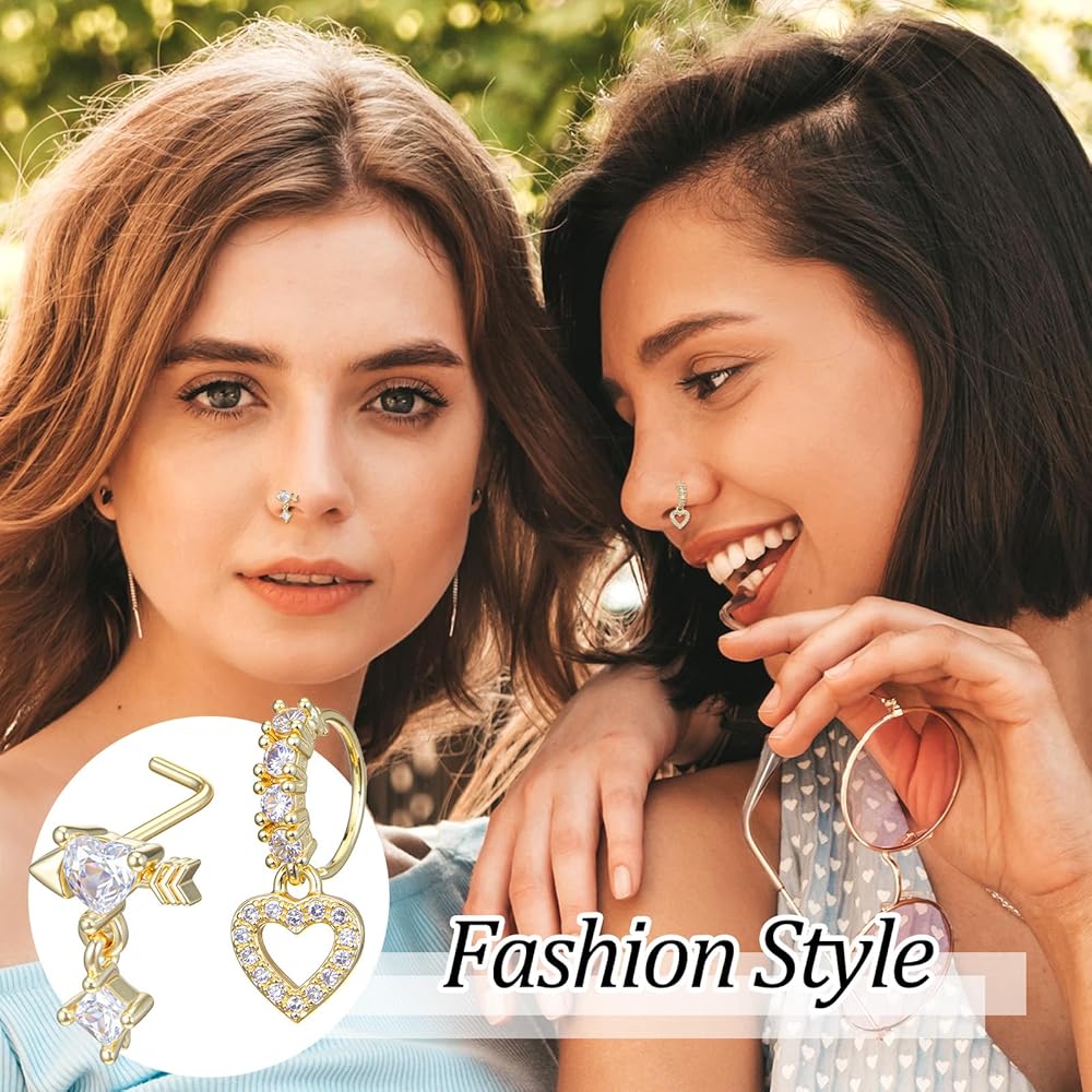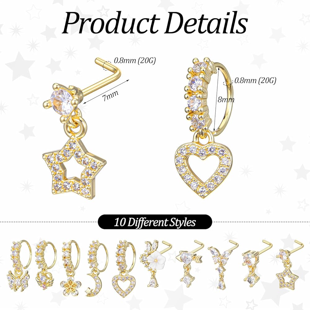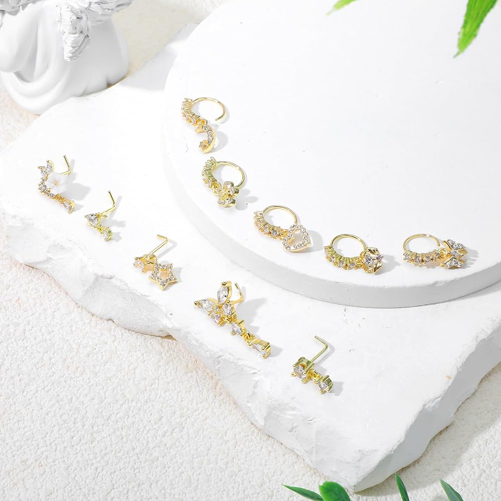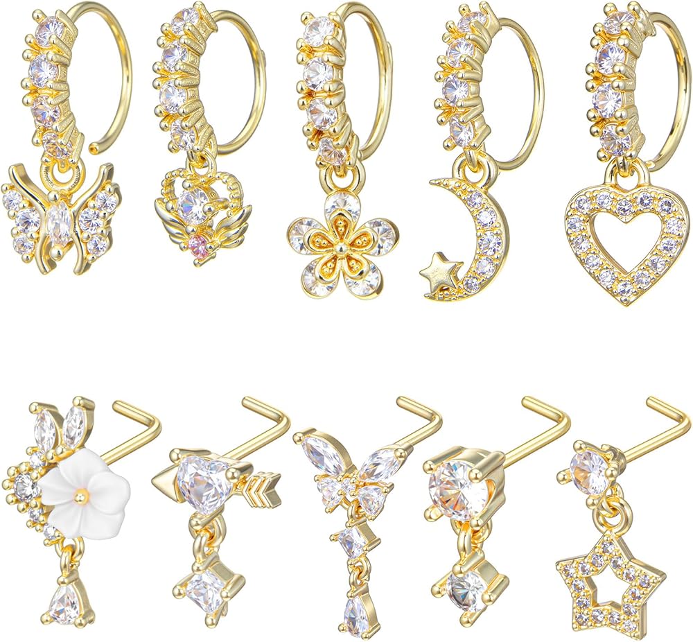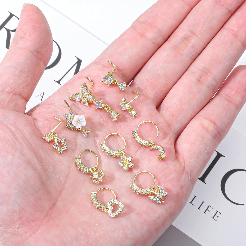 Package Includes: 10pcs gold dangle nose rings featuring zircon pendants. This set includes 5 L-shaped dangly nose rings and 5 hoop styles, offering versatility for any occasion