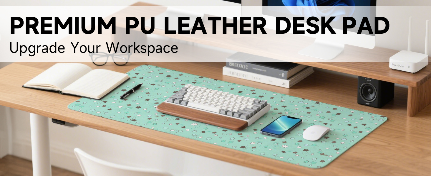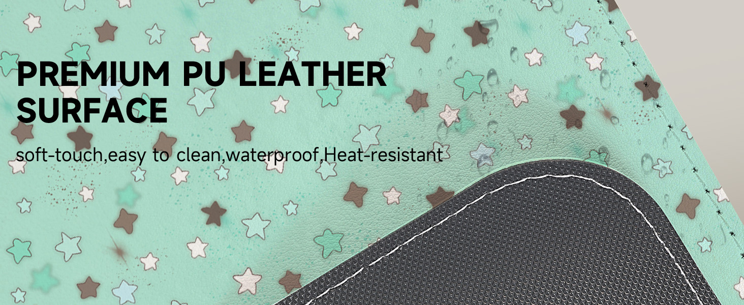 سطح جلد PU ممتاز - ملمس ناعم الملمس يشبه الجلد وسهل التنظيف ومقاوم للارتداء اليومي. قاعدة مضادة للانزلاق تحافظ على ثبات السجادة في مكانها سواء كنت تلعب أو تدرس أو تعمل. حدود أنيقة مخيطة علويًا تمنع الاهتراء.