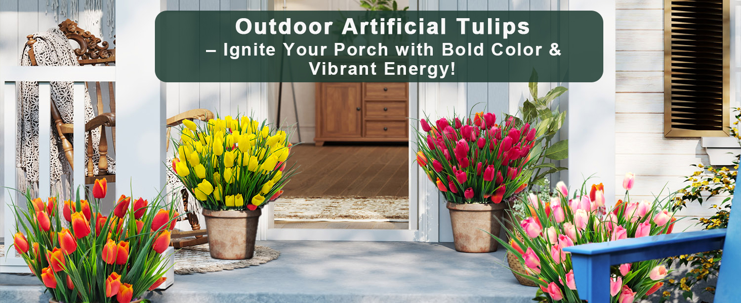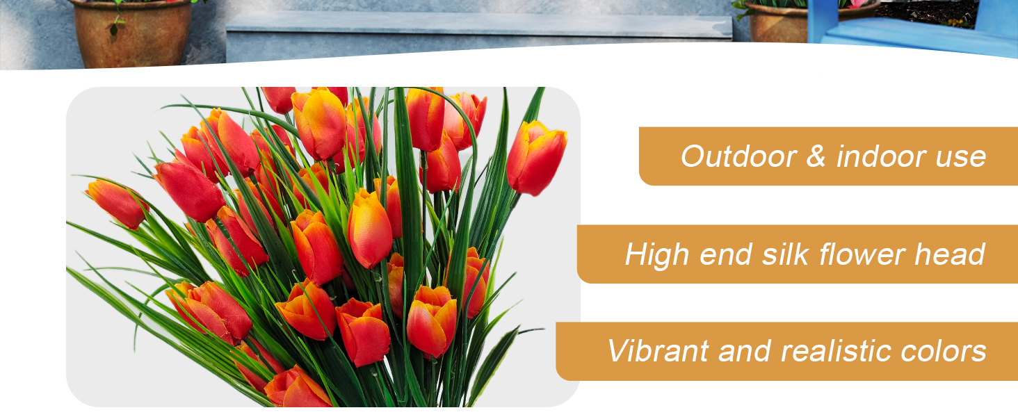 زهور التيوليب المزيفة في الهواء الطلق: على عكس معظم زهور التيوليب المزيفة الموجودة في الأماكن المغلقة فقط، فإن زهور التيوليب المزيفة لدينا مصنوعة من أجل المتانة في الهواء الطلق مع الحفاظ على جاذبية الديكور الأنيق للديكورات الداخلية. مثالية لتحقيق التوازن بين سحر الفناء ودفء غرفة المعيشة