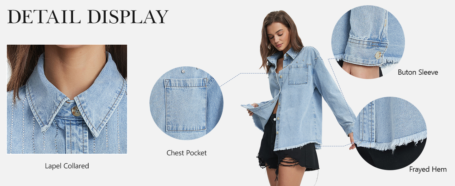 سهولة التطابق: يتناسب هذا القميص المصنوع من الدنيم بسلاسة مع مجموعة واسعة من الملابس السفلية، بدءًا من الجينز الكاجوال والسراويل القصيرة الجلدية الأنيقة وحتى السراويل الضيقة الأنيقة والتنانير متوسطة الطول الفضفاضة. يعد هذا الجاكيت قطعة أساسية حقيقية في خزانة الملابس، حيث يمكن ارتداؤه لأعلى أو لأسفل دون عناء، مما يجعله القطعة المفضلة لديك لابتكار ملابس جديدة ومواكبة للموضة على مدار العام.