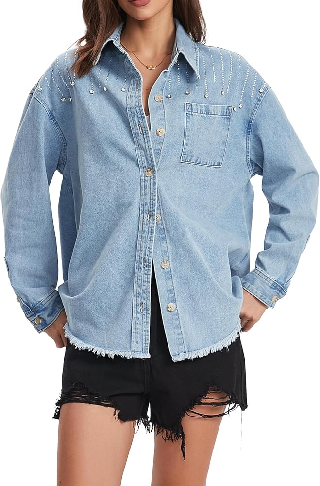 تصميم فريد: يتميز هذا الجاكيت النسائي المصنوع من حجر الراين بأكمام طويلة مع أساور بأزرار، ونمط غسيل متعثر، وياقة مقلوبة، وأحجار الراين المتلألئة، وتصميم Y2K كاجوال ومظهر عصري لملابس الشارع يبرز بين كل الناس.