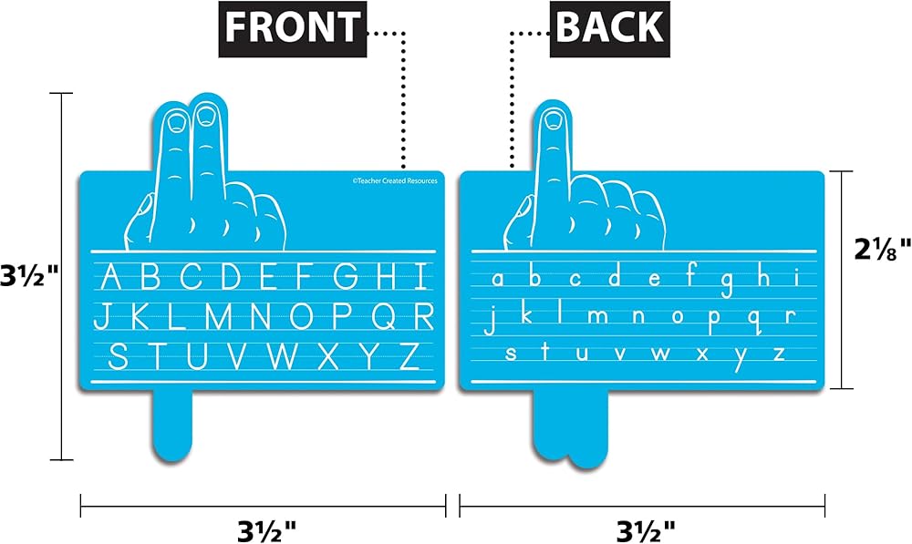 Finger spacers are a convenient tool to help children control letter spacing between words and sentences. Featuring single-finger and double-finger guides, children can practice word spacing effectively—using one finger between words and two fingers between sentences. Spacers are double-sided with uppercase letters on one side and lowercase letters on the other for quick reference.