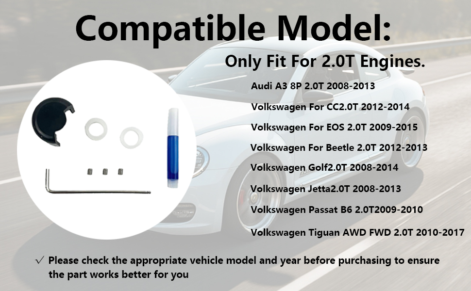 • توافق دقيق للمركبة مصمم حصريًا لمحركات 2.0T، هذه المجموعة تناسب مجموعة واسعة من موديلات Audi وVolkswagen، بما في ذلك Audi A3 8P (2008-2013)، VW Beetle (2012-2013)، CC (2012-2014)، EOS (2009-2015)، Golf (2008-2014)، Jetta (2008-2013)، وباسات B6 (2009-2010)، وتيغوان (2010-2017).